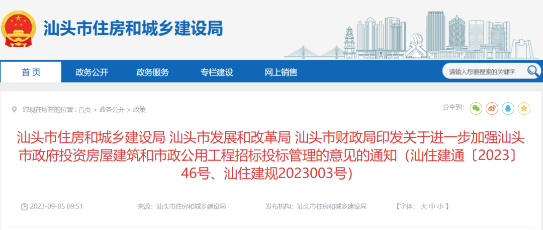 9月5日,汕头市住建局发布《关于进一步加强汕头市政府投资房屋建筑和市政公用工程招标投标管理工作的意见》。自2023年9月1日起实施,有效期至2026年8月31日止。