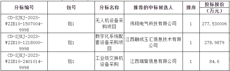 江西省思极科技有限公司2023年8月第01次物资公开招标采购(招标编号:CD-SJKJ-2023-WZZB10)评标工作已经结束。依据《中华人民共和国招标投标法实施条例》、《招标公告和公示信息发布管理办法》对中标候选人公示的规定,现将评标委员会推荐的中标候选人予以公示,公示期3日。投标人或者其他利害关系人若对评标结果有异议的,请在中标候选人公示期间以书面形式(邮件)提出。