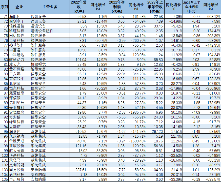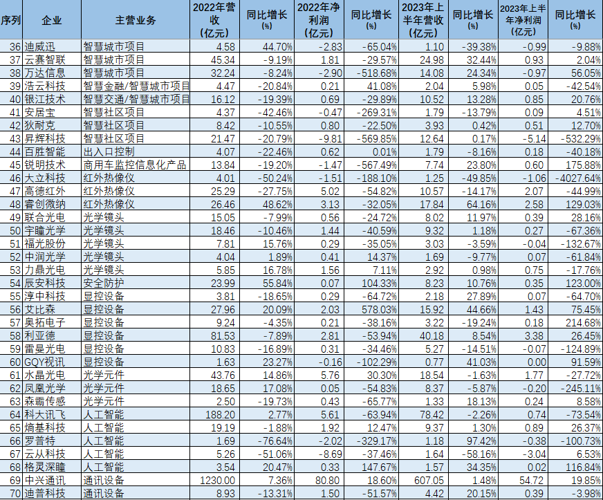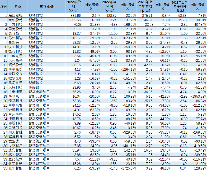 金秋9月,上市公司的半年报已经披露。《中国安防》杂志编辑特将绝大部分安防上市企业以及部分安防产业链中的上市企业共119家的2023年上半年营收数据汇编成表,并将2022年营收情况共同呈现,供各位了解、比较。可喜的是,通过与2022年进行对比,2023上半年绝大部分企业的营收和利润情况有明显提高,详情请看下表。