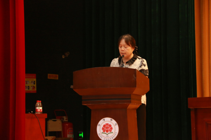 党委书记王化荣致辞,她代表学院全体师生对新生的到来表达了热烈的欢迎与祝贺,同时希望同学们可以牢固理想信念,厚植爱国情怀,坚定爱国心、报国情、强国志,要注重品德修养,提高社会责任意识,珍惜大学生活,做心理健康、专业扎实、品格高尚、思想坚定的优秀大学生。