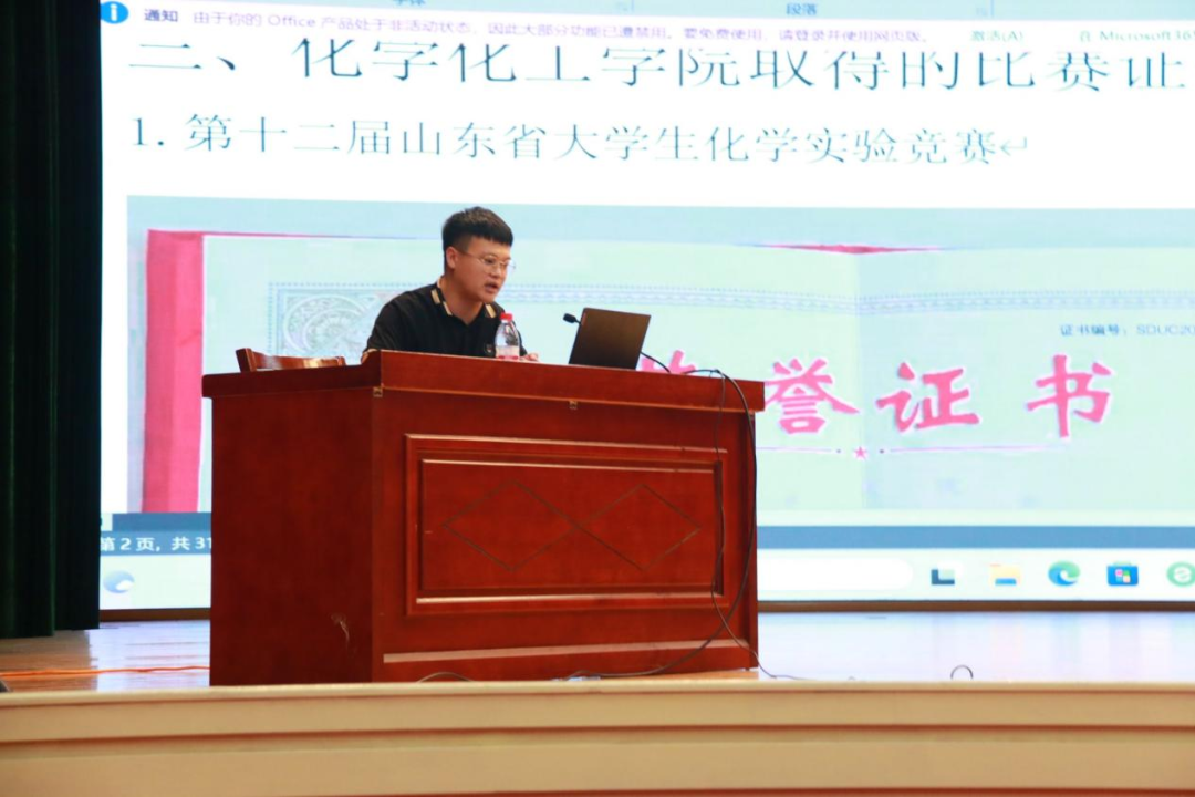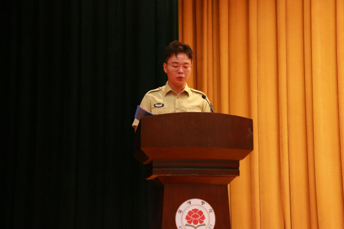 新生代表2023级化学工程与工艺(专升本)班李文淼同学向大家分享了自己参军期间的经历和专科期间在菏院的学习生活,同时表达了自己对大学生活的展望以及对老师领导和同学们的祝福。