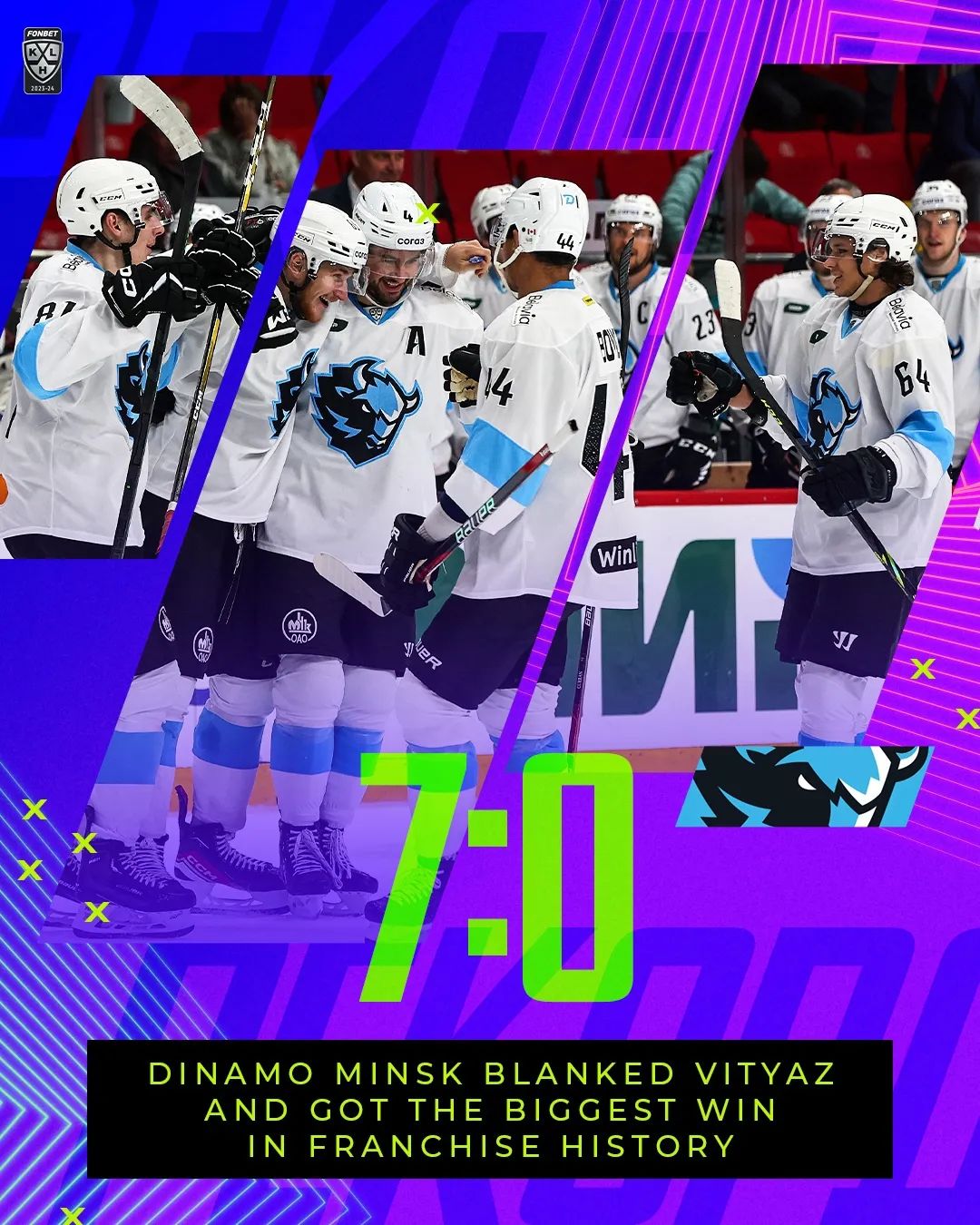 明斯克迪纳摩在首场比赛中以0-3落后情况下逆转胜石化,最终以5-4加时胜对手,而后7-0大胜勇士其中3粒在少防多局面情况下打进的,创下球队KHL历史最大比分胜利。