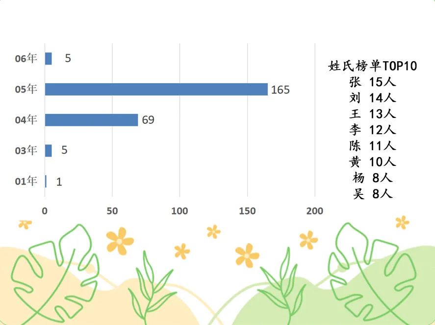 在2023级纺院萌新中,张、刘、王、李、陈、黄、杨、吴是出现最多的姓氏。