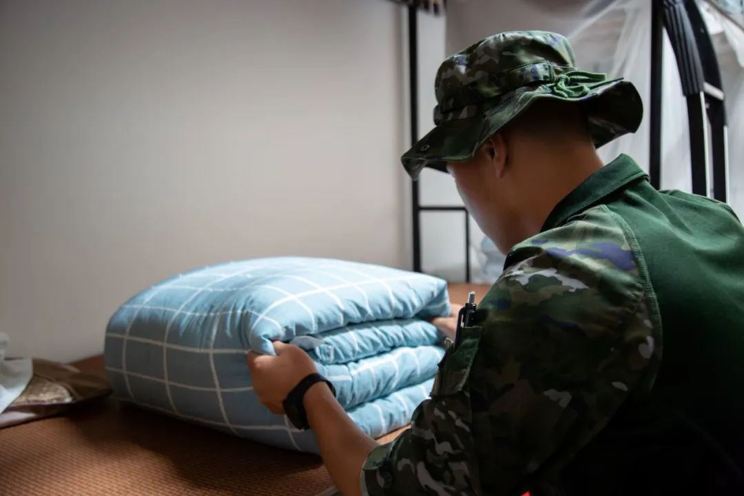 教官亲自教大家叠“豆腐块”,大家都在认真观摩。听到教官们一边整理被褥,一边讲述他们在部队的军旅生活,大家不禁感叹教官们每天生活的高度自律,同时也深感部队要求之严格。