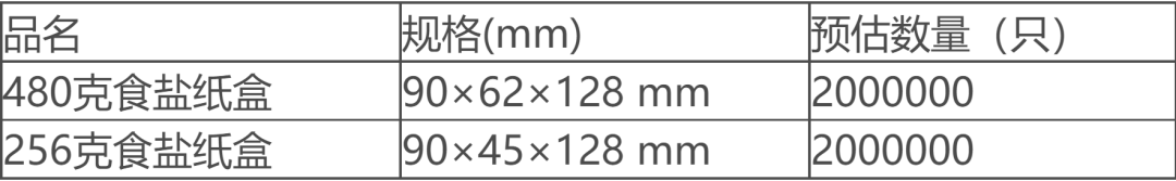 2、招标内容:480克、256克食用食盐纸盒版面按生产要求确定,本次招标量为各版面累计数量总和的预估量400万只/年。