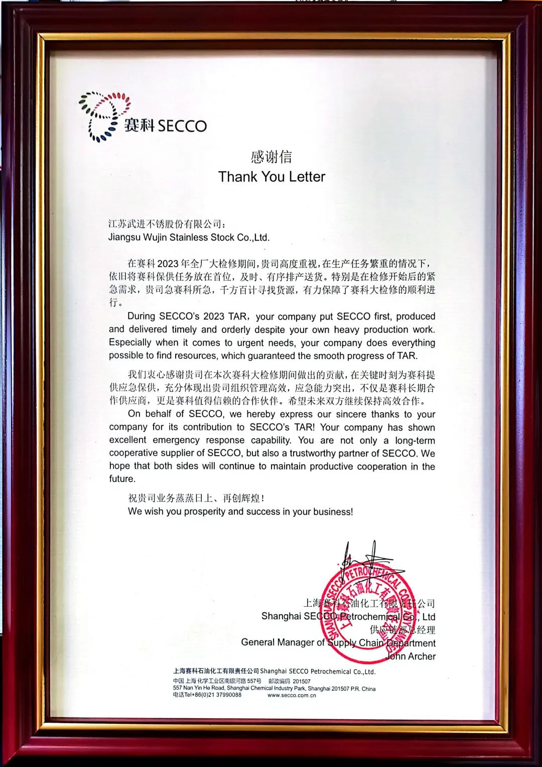 这封感谢信,是市场对公司综合实力的高度认可和信任,武进不锈将上下同心,加强协作,攻坚克难,力求为客户提供优质的产品和完善的服务。