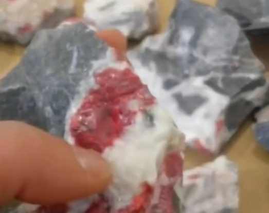 我们先来认识一下原始状态的朱砂矿石。朱砂是从上图这些矿石里面提取出来的。矿石上这些红色的、紫红色的都是朱砂,黑色的和白色的则是朱砂的伴生矿。