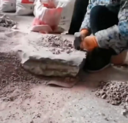 朱砂加工的第一道工艺就是敲碎,工人要把这些石头敲碎成石子,然后再粉碎,收集小的颗粒、细小粉末,经过数次的淘洗筛洗后,把朱砂从这些矿石里面淘洗出来。