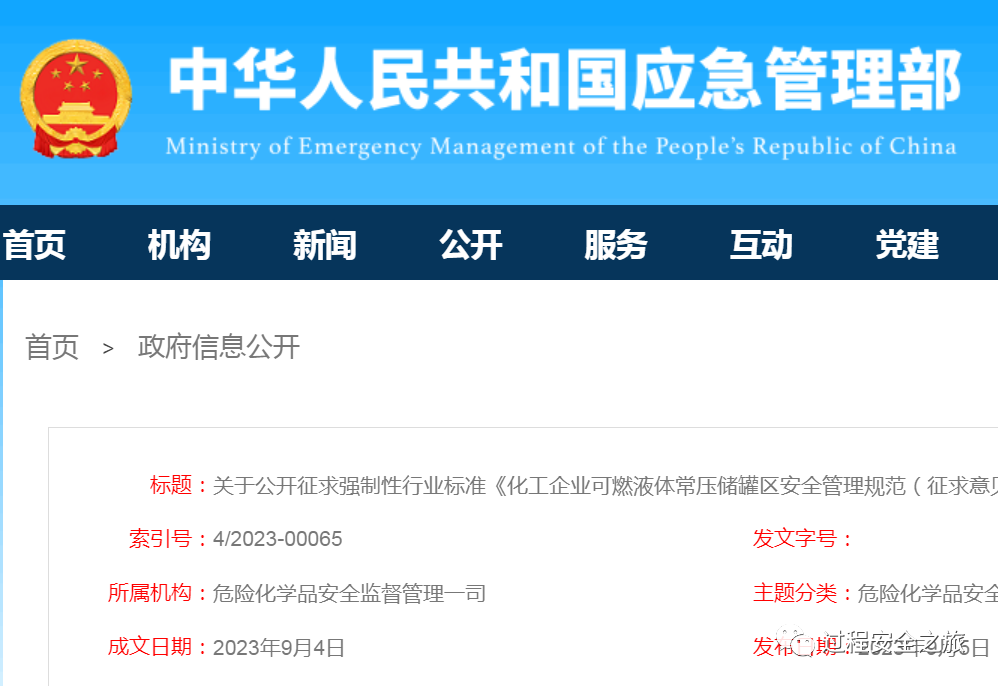 关于公开征求强制性行业标准《化工企业可燃液体常压储罐区安全管理规范(征求意见稿)》意见的函为强化化工企业可燃液体常压储罐区安全风险管控,应急管理部危化监管一司组织有关单位编制了《化工企业可燃液体常压储罐区安全管理规范(征求意见稿)》和编制说明(见附件1、2),现公开征求意见。此次公开征求意见时间为即日起至2023年11月6日,反馈意见请填写应急管理标准项目征求意见表(见附件3)后发送至指定电子邮箱(cycgqaq@163.com)。1.化工企业可燃液体常压储罐区安全管理规范(征求意见稿)2.化工企业可燃液体常压储罐区安全管理规范(征求意见稿)编制说明化工企业可燃液体常压储罐区