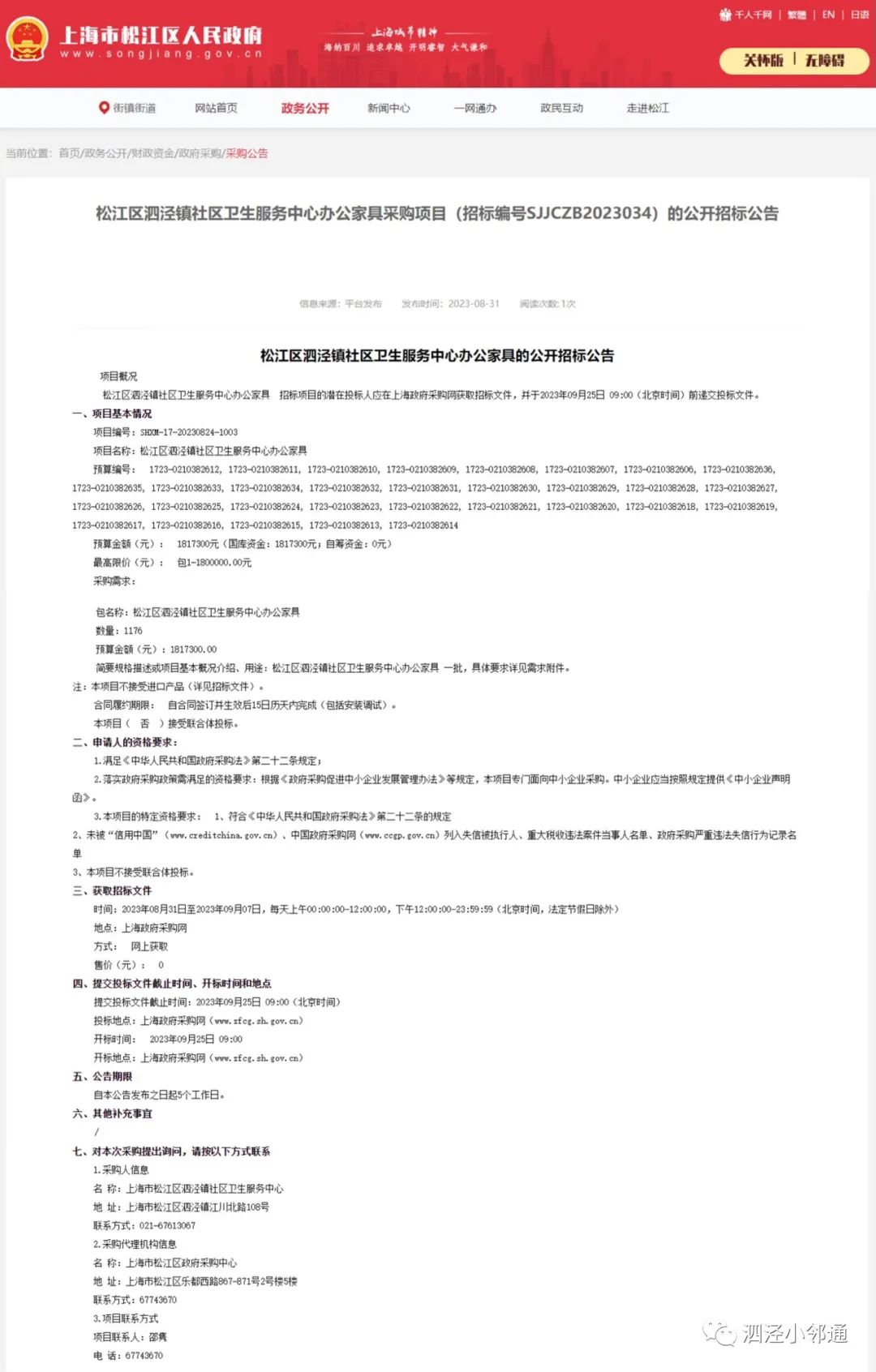 松江区泗泾镇社区卫生服务中心办公家具采购项目(招标编号SJJCZB2023034)的公开招标公告