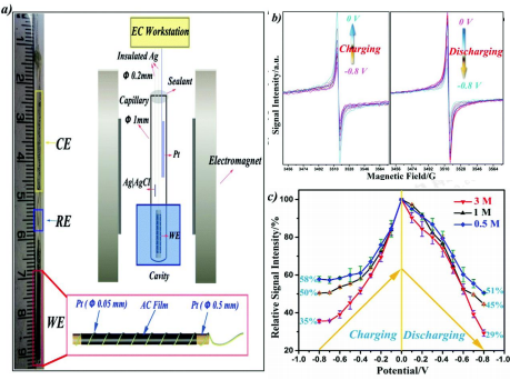 EPR光谱技术的一大特点是可在不影响物理、化学、生物反应过程的前提下对样品进行表征,因此具有原位表征的潜力。英国曼彻斯特大学的王斌等人[7]应用EPR技术对活性炭在水溶液中的电化学电容储存过程进行了原位检测。