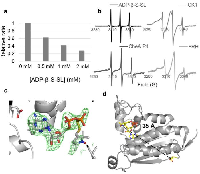 AliseR.Muok等[6]就是根据上述实验思路,采用β修饰的二磷酸腺苷作为自旋标记探针,通过研究标记物侧链的动力学信息,对反应蛋白标记位点的周围环境和空间变化进行了研究。并且证实采用β修饰得到的ADP-β-S-SL是一种有效的进行双电子电子共振(DEER)光谱实验的探针工具。