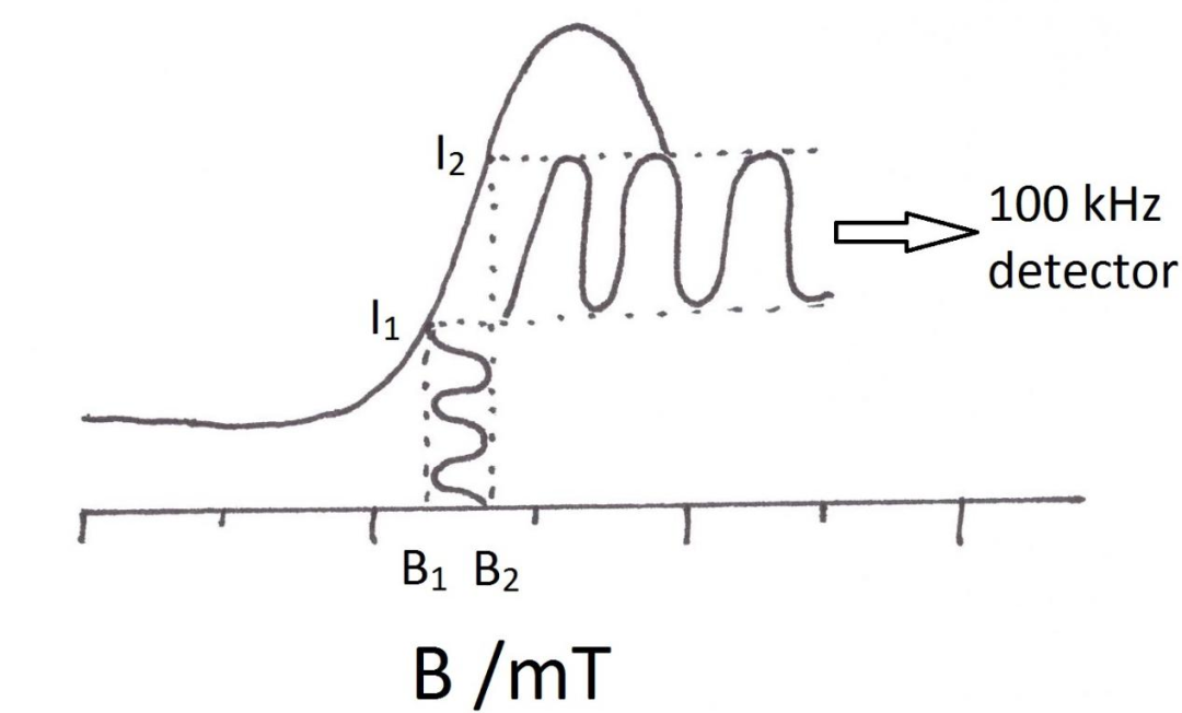 由于这种场调制的方法使用了相敏检波器,仅有相同频率调制的信号(100kHz)可被检测到,这种采用了高频调制和相敏检波的检测方法能够显著提高信噪比。为了进一步提高仪器的分辨率,现代波谱仪还能观测二次微分曲线形式的测量结果。
