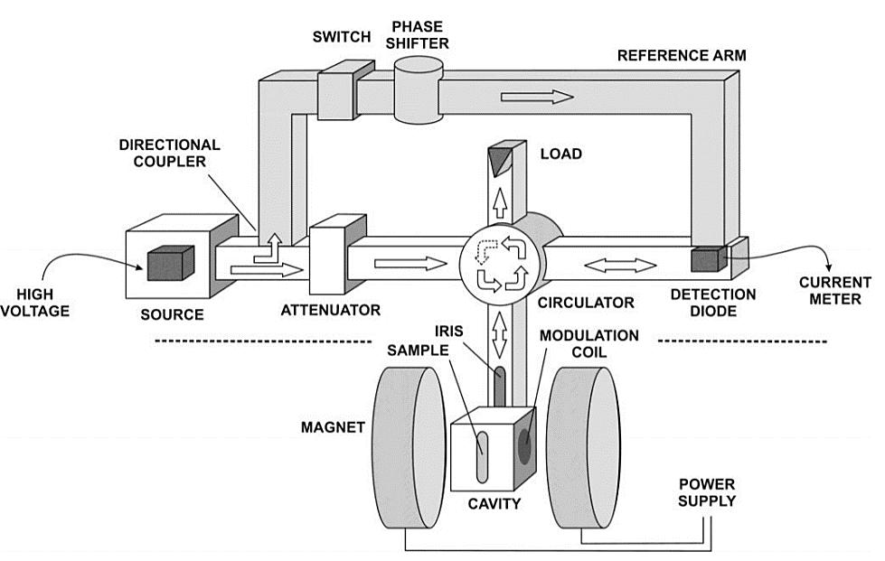 电子顺磁共振波谱仪主要由微波桥、电磁铁系统、传导系统、微波谐振腔、检测系统、调制系统构成。