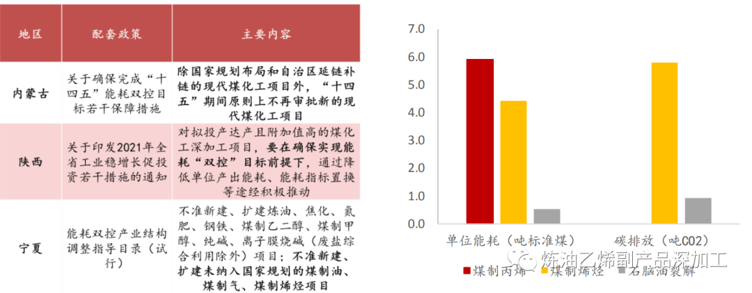 图 现代煤化工主产区所在省份相关限制政策(左)、煤制烯烃项目的能耗及碳排放情况(右)