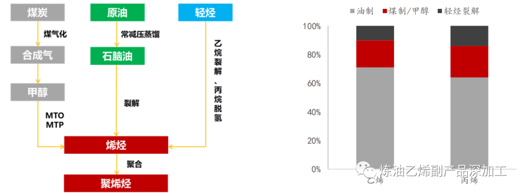国内方面,由于轻烃资源不足,轻烃裂解处于起步阶段,烯烃产能以油制为主,煤制为辅。