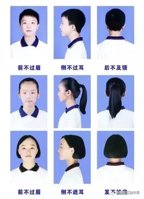 1、男生发型:男同学不得留长发,不得剃光头,不得染发、烫发,做到前额处不过眉毛,后部头发不能遮衣领,鬓发不遮耳朵,鬓角不超耳垂,不留怪发型。