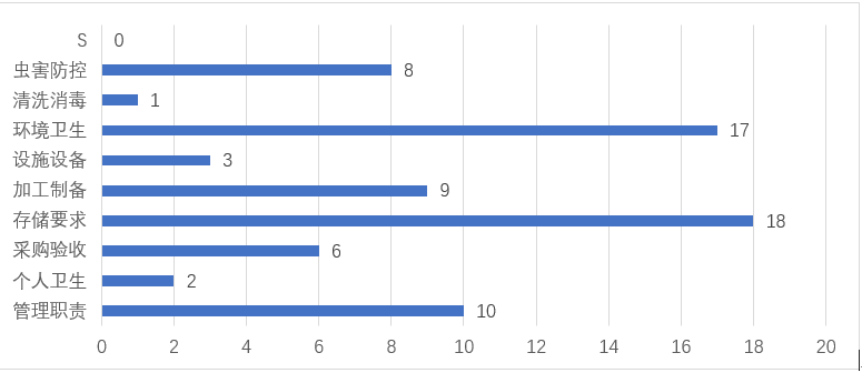 8月对7个餐厅进行食品安全检查,共发现问题74项,其中管理职责类10项,个人卫生类2项,采购验收类6项,存储要求类18项,加工制备类9项,环境卫生类17项,设施设备类3项,清洗消毒类1项,虫害防控类8项。