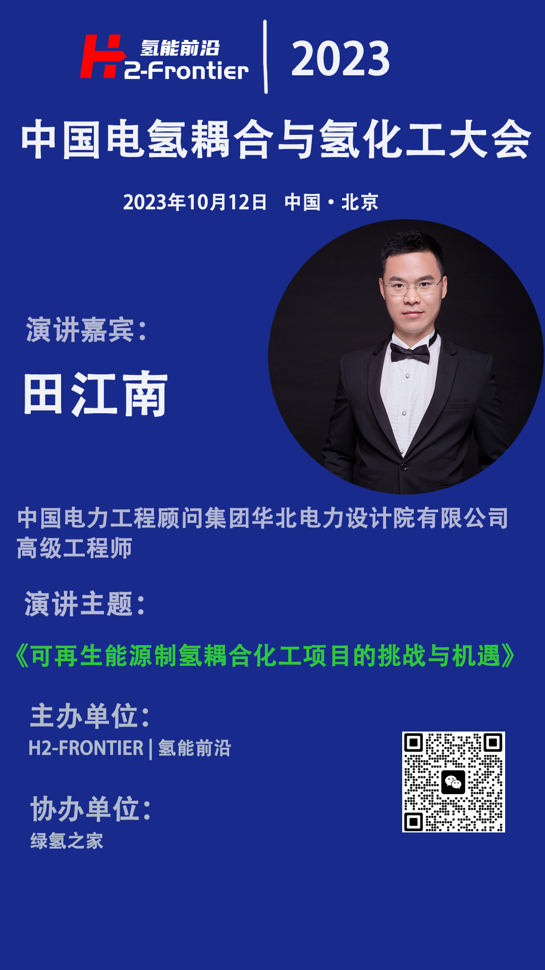 2023年10月12日,在氢能前沿主办的“中国电氢耦合与氢化工技术创新大会”上, 中国电力工程顾问集团华北电力设计院有限公司高级工程师田江南先生将发表演讲《可再生能源制氢耦合化工项目的挑战与机遇》。