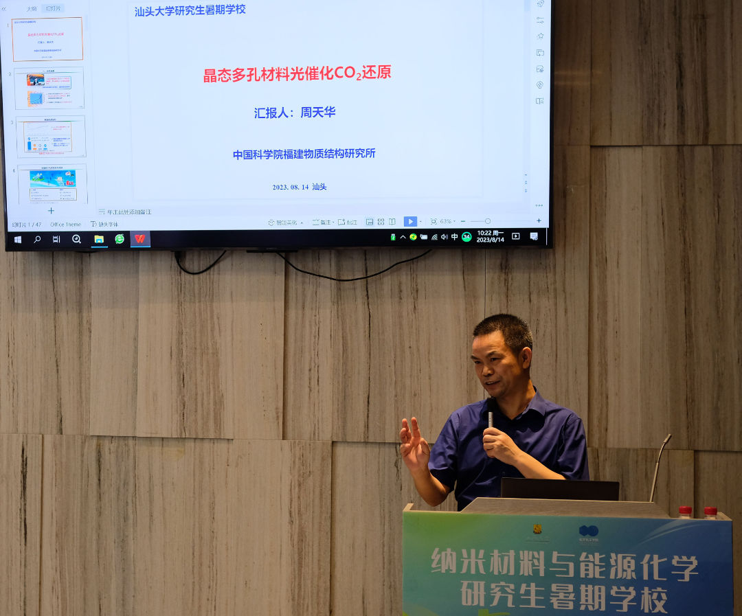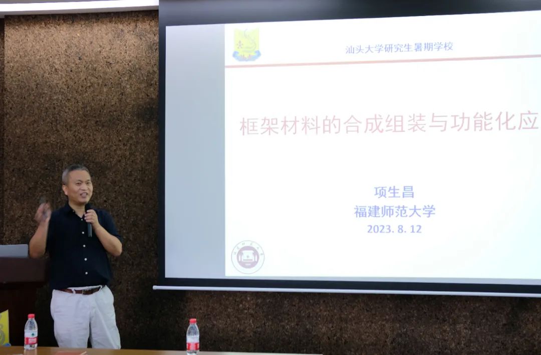 2023年8月9日至8月15日, 汕头大学化学化工学院举办“纳米材料与能源化学”研究生暑期学校活动,旨在服务国家“2030年碳达峰,2060年碳中和”目标,拓展相关专业研究生纳米材料和能源化学领域学术视野,激发科研兴趣,提升实习实践能力和科研创新能力,促进各位学员充分利用暑期时间求取新知,掌握学科前沿动态,营造浓厚的科研氛围。8月10日上午, “纳米材料与能源化学”研究生暑期学校暨香港大学理学院-化学与精细化工广东省实验室联合培养博士研究生暑期研学活动开幕仪式在化学与精细化工广东省实验室(简称汕头实验室)举行。开幕式由化学化工学院院长黄晓春主持,汕头大学副校长刘文华、香港大学支志明院士、汕头市科学技术局局长陈艳莉先后在开幕活动上致辞。汕头大学、香港大学、广东以色列理工学院、汕头实验室共200多名师生、科研人员参加活动。开幕式后,暑期学校的学员们参观了汕头实验室, 感受到汕头大学、汕头实验室以及香港大学雄厚的科研基础和实力。8月10日下午和11日上午, 香港大学联培博士先后做学习汇报展示,汕头实验室5个科研团队分别开展项目情况介绍,暑期学校的老师和学员们到场交流学习。8月12日-14日,华中科技大学的谭必恩教授,福建师范大学的项生昌教授、张霄教授,华南师范大学的李伟善教授,华南理工大学的黄良斌教授,苏州大学的康振辉教授,福建物构所的周天华研究员分别为暑期学校开课,为同学们介绍各自的研究领域、最新进展、未来前景,并交流科研、学习经验。谭必恩教授(华中科技大学)——多孔有机聚合物的构建及其在能源领域中的应用项生昌教授(福建师范大学)——框架材料的合成组装与功能化应用