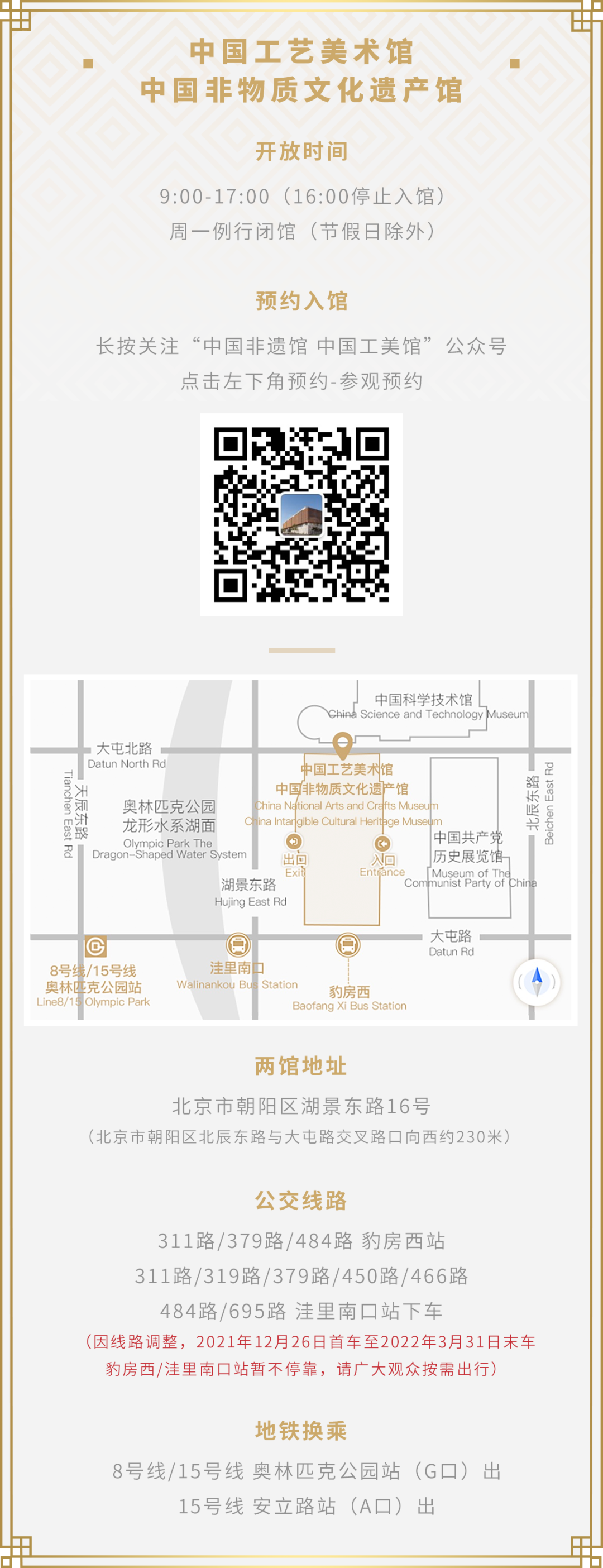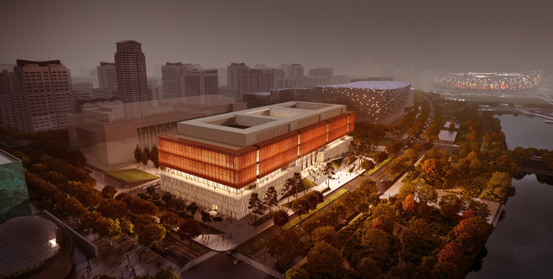 中国工艺美术馆、中国非物质文化遗产馆建筑面积91126平方米,地上共六层,位于北京中轴线北延长线上,西侧紧邻奥林匹克森林公园,东侧坐落着纪念建党百年落成的中国共产党历史展览馆,北侧有中国科技馆,南面有中国历史研究院、“鸟巢”体育馆等建筑,一条蜿蜒的龙形水系穿行其中,将生态、科技、文化和奥运主题联系在一起,形成了一个新的文化集群地。
