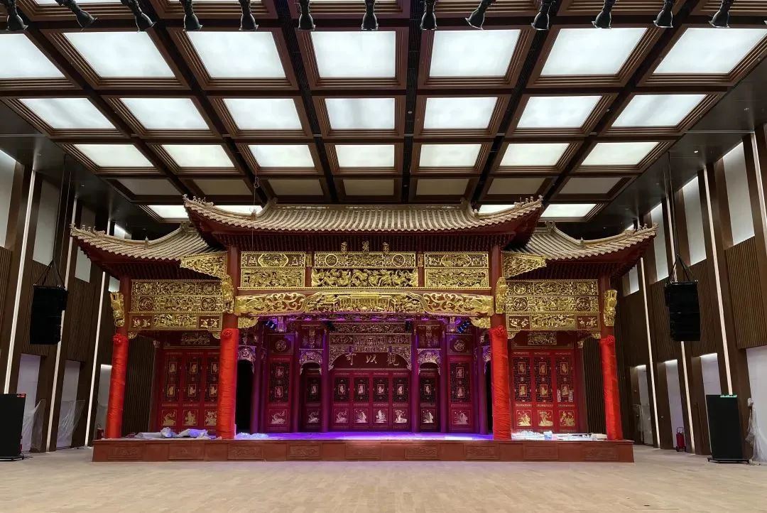 中国工艺美术馆、中国非物质文化遗产馆的多功能厅特设一座传统戏台,既能体现中国传统木结构营造技艺,又能承担非遗项目演出任务。该戏台由乐平市中乐徽派古建筑修复有限公司捐赠。