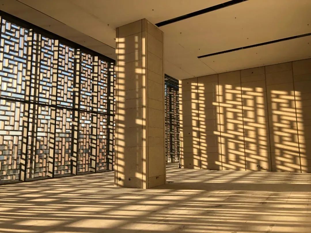 馆的外表面肌理采用暖铜色幕墙材质,图案借鉴中国古典建筑中的花窗及传统收藏用家具博古架的多宝格构图,通过对传统图案的抽象提炼,形成具有工艺美术特色的独特创新纹样。这种金属格栅装饰手法对室内空间起到有效的遮阳效果,同时镂空的形式自然呈现生动的光影变化,使整个建筑显得灵动多姿、活力四射。