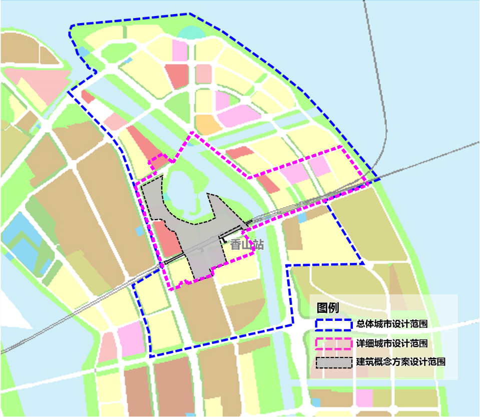 南中城际计划于2027年建成通车,该项目是实施粤港澳大湾区国家战略的重点工程,兼具城际铁路和城市轨道交通双重属性,使中山快速连接深圳、广州、珠海,助力实现大湾区城市群同城化、一体化融合发展。担负促进中山化几何中心为能量中心,快速成为大湾区新的增长极的重要使命。The Nansha (Guangzhou)-Zhongshan Intercity Railway is scheduled to be completed and open to traffic in 2027. The project is a key project for the implementation of the national strategy of Guangdong-Hong Kong-Macao Greater Bay Area, with the dual attributes of intercity railroad and urban rail transit, enabling Zhongshan to quickly connect to Shenzhen, Guangzhou and Zhuhai, and helping to realize the co-location and integrated development of the city clusters in GBA. It has the important mission of promoting Zhongshan to become a new growth pole in GBA by turning its geometric center into an energy center.中山市委、市政府以南中城际建设为契机,开展了全线TOD前置研究,其中将香山站区块定位为门户引流、活力之源,将以轨道构建同城优势和“零深优势”,构建国际青年时尚活力中心,广深研发转化和应用创新承载地。香山站TOD对进一步推动翠亨新区跃升至珠江口“黄金内湾”的舞台C位,成为深中广珠的人才栖息福地和创新创业高地具有战略意义。Zhongshan Municipal Party Committee and Municipal Government take the construction of Nansha (Guangzhou)-Zhongshan Intercity Railway as an opportunity to carry out the entire line of TOD’s front study, where the Xiangshan Station block is positioned as a gateway to attract flow and the source of vitality. We will build a co-location advantage super close to Shenzhen through the rail, build an international youth fashion vitality center, and serve as a carrier for research, development, transformation, and application innovation in Guangzhou and Shenzhen. The TOD of Xiangshan Station is of strategic significance to further promote Cuiheng New District to be the center of the "Golden Inner Bay" at the mouth of the the Pearl River, and to become a paradise for talents and a highland for innovation and entrepreneurship in Shenzhen, Zhongshan, Guangzhou and Zhuhai.为加快香山区块TOD项目的落地,中山市自然资源局联合中山翠亨新区管理委员会、中山市轨道交通有限公司组织开展南中城际香山站“一湖一站”城市设计与环翠湖公园地块建筑概念方案设计竞赛工作,高站位、高品质、高标准地将香山站区块打造成世界级TOD标杆。In order to accelerate the landing of Xiangshan block TOD project, Zhongshan Natural Resources Bureau, Zhongshan Cuiheng New District Management Committee and Zhongshan Rail Transit Co., Ltd. organized a competition for the design of Nansha (Guangzhou)-Zhongshan Intercity Railway Xiangshan Station "One Lake, One Station" Urban Design and Architectural Conceptual Design of the Surrounding Cuihu Park Plot. The Xiangshan Station block will be built into a world-class TOD benchmark with high standing, high quality and high standard.本项目主要设计任务分为以下三个层次,其中环翠湖公园地块建筑概念方案设计为本次竞赛的重点。(具体要求详见附件2-《设计任务书公告版》,最终要求以后续正式发布的《设计任务书》为准):The design task of this competition is divided into three parts, which the architectural conceptual design of Surrounding Cuihu Park Plot is the focus of this competition. (Refer to Annex 2- Design Specification Announcement Version for detailed requirements. The final requirements are subject to the final Design Specification)范围规模约710公顷,10644亩(图-1中蓝线区域)。工作内容包括但不限于:从总体层面研究片区发展目标、优化用地功能布局、空间结构及形态、公共空间体系等。Scope of general urban design: Scale of about 710 hectares, 10,644 mu (blue line area in Figure-1).The work includes but is not limited to: studying the development goals of the area from the overall level, optimizing the functional layout of land use, spatial structure and form, and public space system.范围规模约198公顷,2970亩(图-1中玫红线区域)。工作内容包括但不限于:深化研究“一湖一站”区域的规划目标定位、产业功能、开发规模和强度、天际线、重要景观设计、重要界面控制、公共开敞空间、交通系统、地下空间等方面内容开展整体构思及细化设计,提炼详细设计导则,提出控规衔接指引。Detailed Urban Design of Core Area:Scope of detailed urban design: Xiangshan Station "One Lake, One Station" area, with a scale of about 198 hectares, 2,970 mu (Rose red line area in Figure-1).The work includes but is not limited to: deepening the research on the planning target positioning, industrial functions, development scale and intensity, skyline, important landscape design, important interface control, public open space, traffic system, underground space and other aspects of the "One Lake, One station" area, carrying out the overall conception and detailed design, refining the detailed design guidelines, and putting forward the guidelines for the connection of control regulations.范围包括站点两侧环翠湖公园地块,其中建设地块规模约36.83公顷,约552亩(图-1中黑线部分)。工作内容包括但不限于:提出建筑概念设计方案,对建筑功能布局、规模、风貌、景观环境、地下空间等进行研究设计及项目经济测算,并对轨道一体化及规划条件提出优化建议。Architectural Conceptual Design of the Surrounding Cuihu Park Plot:Scope of Architectural Conceptual Design: Surrounding Cuihu Park Plot, with a scale of about 36.83 hectares, 552 mu (black line area in Figure-1).The work includes but is not limited to: putting forward the