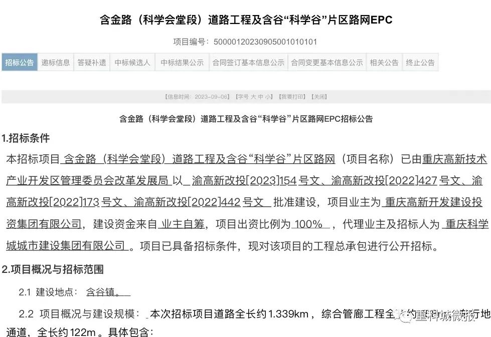 9月6日,《含金路(科学会堂段)道路工程及含谷“科学谷”片区路网EPC招标公告》。本招标项目含金路(科学会堂段)道路工程及含谷“科学谷”片区路网(项目名称)已由重庆高新技术产业开发区管理委员会改革发展局以 渝高新改投[2023]154号文、渝高新改投[2022]427号文、渝高新改投[2022]173号文、渝高新改投[2022]442号文批准建设,项目业主为重庆高新开发建设投资集团有限公司,建设资金来自业主自筹,项目出资比例为100%,代理业主及招标人为重庆科学城城市建设集团有限公司 。本次招标项目位于含谷镇。项目道路全长约1.339km,综合管廊工程全长约658m,车行地通道,全长约122m。具体包含:1、含金路(科学会堂段)道路工程:呈东西走向,西起于规划新春路,下穿科学会堂,东止于科学大道已建车行地通道,为城市次干路,道路全长约430m,标准路幅宽度26m,双向四车道,设计时速30km/h。2、含谷“科学谷”片区路网—含金一路工程:呈东西走向,西起在建新森大道,东至规划金阜路,全长约151.20m,为城市支路,设计速度20km/h,标准路幅宽度为16m,标准段为双向两车道。3、含谷“科学谷”片区路网—含金路工程:呈东西走向,西起现状义同路,东至规划新春路,全长约326.429m,为城市次干路,设计速度40km/h,标准路幅宽度为26m,标准段为双向四车道。4.、含谷“科学谷”片区路网—义盛支路工程:呈东西走向,西起义同路,东至规划新春路,全长约431.242m,为城市支路,设计速度30km/h,标准路幅宽度为16m,标准段为双向二车道。5、新春路车行地通道工程:西起于科学服务中心,东至科学会堂,全长约122m。6、含金路综合管廊工程:西接新春路综合管廊,东接已建科学大道综合管廊,全长约380m,纳入电力、给水、中水、通信四类管线。7、新春路综合管廊工程:北起于高龙大道,南至含金路,全长约278m,纳入电力、给水、中水、通信四类管线。本次招标范围主要包括施工图设计、工程施工等内容,工期要求为:声明:除原创内容及特别说明之外,推送稿件文字及图片均来自网络及各大主流媒体。版权归原作者所有。所有内容均出于信息传播之目的,仅代表作者观点,如要参考所发布的信息时请自行核实。如认为内容侵权,请联系我们删除。欢迎大家关注公众号发表意见或来稿。