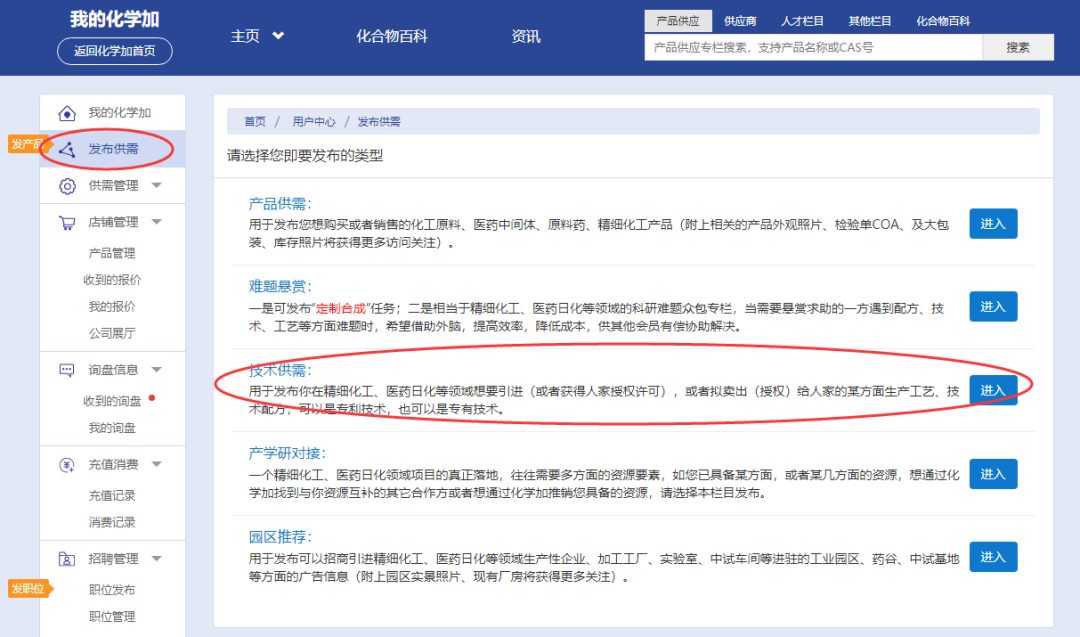 注册登录化学加网站,进入“用户中心”-“发布供需”-“技术供需”,即可发布技术供需内容。用户可以选择内容公开或不公开