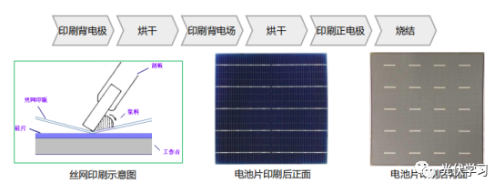 11.1、 丝网印刷:在硅片表面印刷电极和电场,顺序印刷背电极、背电场、正电极,流程如下: