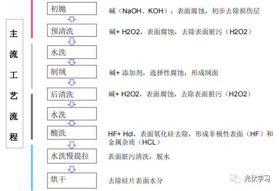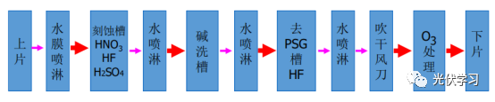 5.2、 刻蚀目的:扩散过程中,磷会扩散到硅片的边缘,造成短路,并在硅片表面形成一层含有P原子的二氧化硅,即PSG。刻蚀的目的就是去除边缘的PN结、去除PSG。在PERC电池工艺中,刻蚀同时,需要对背面进行抛光处理。