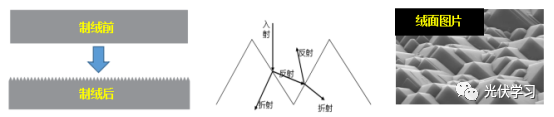 3.1、 制绒目的:形成绒面,利用陷光原理,减少光的反射,提高短路电流(Isc),增加PN结面积,最终提高电池的光电转换效率。去除硅片表面的机械损伤层 ;清除表面油污和金属杂质;(多晶形成凹坑状绒面),单晶形成金字塔状绒面,增加硅对太阳光的吸收。
