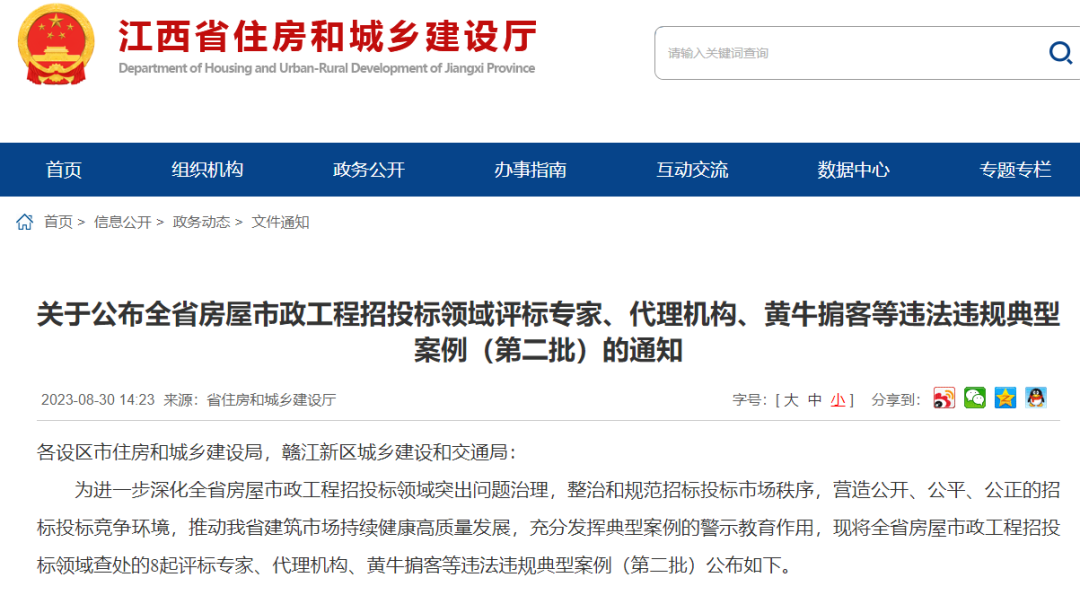 为进一步深化全省房屋市政工程招投标领域突出问题治理,整治和规范招标投标市场秩序,营造公开、公平、公正的招标投标竞争环境,推动我省建筑市场持续健康高质量发展,充分发挥典型案例的警示教育作用,现将全省房屋市政工程招投标领域查处的8起评标专家、代理机构、黄牛掮客等违法违规典型案例(第二批)公布如下。