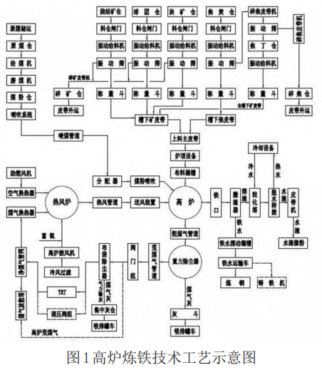 相较于其他类型的冶炼工艺,高炉炼铁在可操作性、产量、劳动生产效率以及综合能耗方面具有较显著的优势。因而,高炉炼铁在钢铁冶炼领域中占据重要地位。随着人们对环保、钢铁质量、冶炼成本控制等方面需求的不断提高,高炉炼铁工艺也在不断优化。本文介绍了高炉炼铁的主要工艺结构,指出了当前高炉炼铁的生产困境,分析了高炉炼铁工艺优化的重点,提出未来高炉炼铁将持续朝着节能减排与智慧智能的方向发展。经过长期的发展,现代高炉炼铁在技术与工艺方面已经十分成熟,劳动生产率、综合成本等方面也较为可观。但是,随着国内外对环保问题的重视程度不断提高以及我国政府对“碳达峰”与“碳中和”目标的允诺,钢铁冶炼产业受到了更多的关注。高炉炼铁的主要产出物为生铁,副产物包括高炉渣、高炉煤气、除尘灰等。高炉炼铁工艺的基本原理是在高炉内加入焦炭、铁矿石、白云石等原燃料,同时在高炉下方各方向涌入经充分预热的空气。焦炭、煤粉等燃料及重油、天然气等中间产物,在高温环境下与氧反应生成氢气与一氧化碳,这些生成物在高炉内上升的过程中,与铁的化合物发生反应,经过还原反应得到生铁。高炉炼铁的技术工艺示意图如图1所示。高炉炼铁的完整工艺结构主要包括上料系统、炉体系统、热风系统、渣处理系统、出铁场系统、炉顶系统、喷吹系统、辅助系统等组成。其中,上料系统由矿槽、焦槽、筛分设备、称量设备、输送胶带机、斜桥或上料主皮带结构等组成,其功能主要为根据生产需求将各种原料输运到高炉内;炉体系统主要由高炉内衬、炉体冷却单元、炉体检测设施、炉体控制设施、高炉炉壳、支撑框架结构等组成,炉体系统是高炉炼铁工艺产出铁水的主要单元;炉顶系统主要用于根据工艺设定向高炉内完成各种原料的布料,其主要组成部分包括料罐、固定受料漏斗、气密箱、阀箱、溜槽等;热风系统主要用于加热风至 1200℃,并经特殊管道将热风引入高炉,其主要组成部分包括热风炉、空煤气换热器、助燃风机、热风输送管道等;喷吹系统主要将煤粉加工成符合要求的粒径大小,在充分干燥后,使用气流将煤粉送入高炉内,其组成单元主要有煤粉制备设施、煤粉干燥设施、煤粉喷吹设施等;渣处理系统主要用于处理及回收高炉炼铁产生的残渣,其主要组成单元包括炉渣粒化设施、渣脱水设施、渣运输设施等。现代高炉炼铁工艺的诞生,极大地提高了钢铁的冶炼效率、冶炼产量以及成品质量。据统计,2021年我国生铁总产量高达 8.68 亿吨,占世界生铁总产量的六成以上。近几年,我国高炉炼铁产出的生铁在全球生铁总产出中也占有极高的比重。虽然我国的高炉炼铁总产能一直保持在较高的水平,但是相比其他发达国家,在综合成本、经济效益、自动化与智能化等方面存在一定差距。近年来,我国政府开始致力于产业供给的结构化转型,针对高炉炼铁产业的工艺与技术优化,需要摆脱以下几个方面的发展困境:其一,传统的高炉炼铁工艺过程控制不够直观,生铁在高炉内冶炼时的状态既无法直观的观测,也没有专业检测系统进行监测,高炉冶炼工艺的操作与成品质量控制对操作人员的经验与技术积累依赖程度高,高炉内生产环境波动较大,总体的生产稳定性与 可靠性不足;其二,随着对环保问题重视程度的提高,各国纷纷加大了对焦炭产量与使用的限制,而作为钢铁冶炼的重要原料,焦炭来源的减少直接影响了高炉冶炼的生产成本;其三,高炉冶炼的产出物生铁是钢铁工业最重要的原料之一,但是,现阶段生铁冶炼消耗的能源与产生的废气、废水等污染因子占据了钢铁冶炼全寿命周期的一半以上,特别是酸性气体SO2与温室气体CO2的排放,更是造成了严重的环境问题;其四,当前高炉炼铁的综合成本偏高,自动化水平较低,产能的持续提高与企业经济效益的实现具有较大的现实困难;其五,高炉炼铁工艺涉及原料热处理、铁元素还原、熔化、造渣、脱硫等多个环节,整个工艺流程的控制十分繁琐。近年来,生铁冶炼产量不断增加,同时,随着矿产资源开采时间的累计,优质铁矿石的可用储量越来越少,因而,高品位铁矿石原料的单位采购价格不断上升,导致高炉炼铁企业的生产成本越来越高。热压含碳球团在还原性、冶金性能、冷态抗压强度、高温还原反应强度、渗碳性等方面均具有较好的表现,可减少单位生铁的燃料消耗量,因而成为高炉炼铁原料的良好替代品。在高炉炼铁工艺中添加适量的热压含碳球团,可显著改善高炉热的利用效率,还可以起到一定的降低焦比的作用。需要注意的是,在高炉炼铁中添加热压含碳球团,会造成渣铁温度下降影响渣铁流动性的问题,因此,添加热压含碳球团时应保证渣铁温度不能过大。在高炉冶炼工艺中,入炉原料的选择与品质直接关系着产出物铁水的品位与产量,还会在相当程度上影响冶炼过程的燃料消耗与污染物的排放。因此,强化对入炉原料的原则具有重要的作用。入炉原料的原则与控制应以原料的品质与焦炭质量管理为重,一方面要选择反应性与热强度好,且水分、挥发性、硫分、灰分、粒度均匀性等指标均较好的焦炭,以降低高炉冶炼过程中炉内环境的波动;另一方面应优先选择强度、还原性,特别是要以低温还原性以及粒度均匀性较好的烧结矿为冶炼原料。此外,随着金属化球团矿冶炼