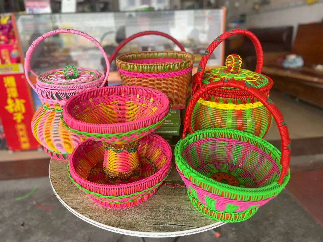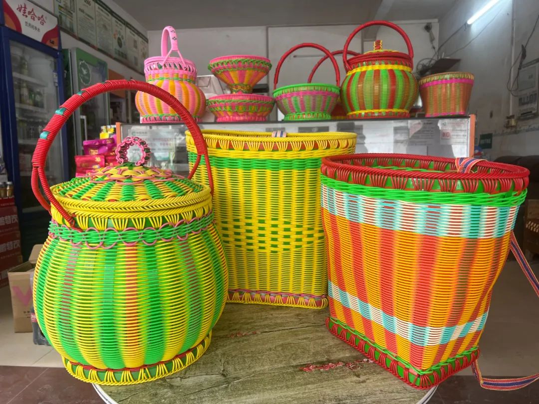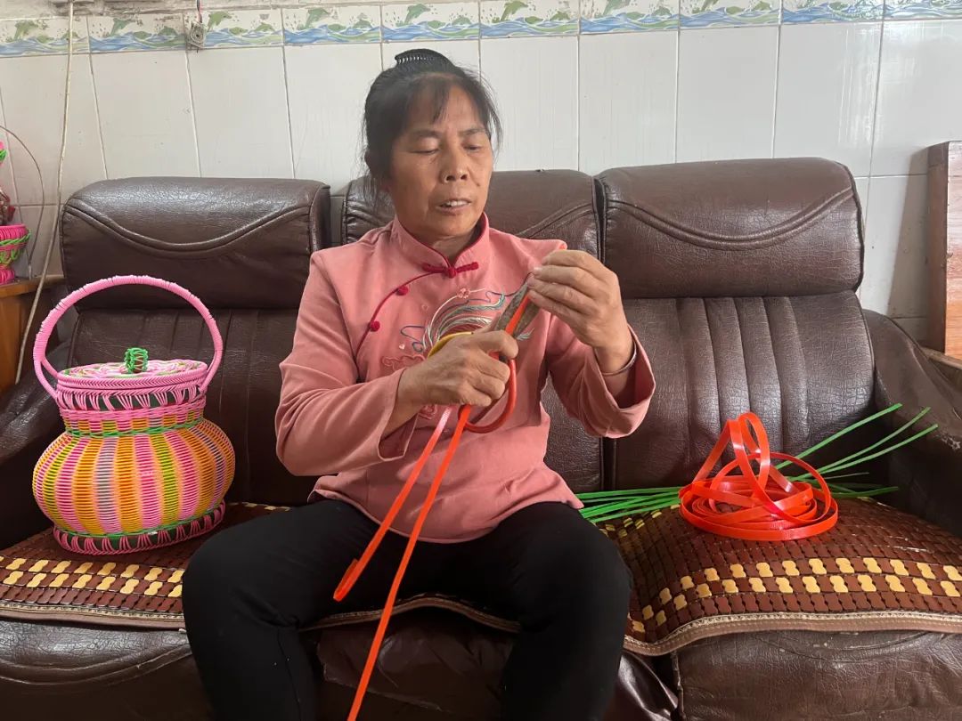 蓝大娘编制的花篮质量过硬、造型好看,本村村民成了她的首批客户,有的买来自用,有的买来送亲朋。小小花篮承载着浓浓祝福,在人们的一开一合间见证和陪伴了新圩人度过人生中一个个重要时刻。