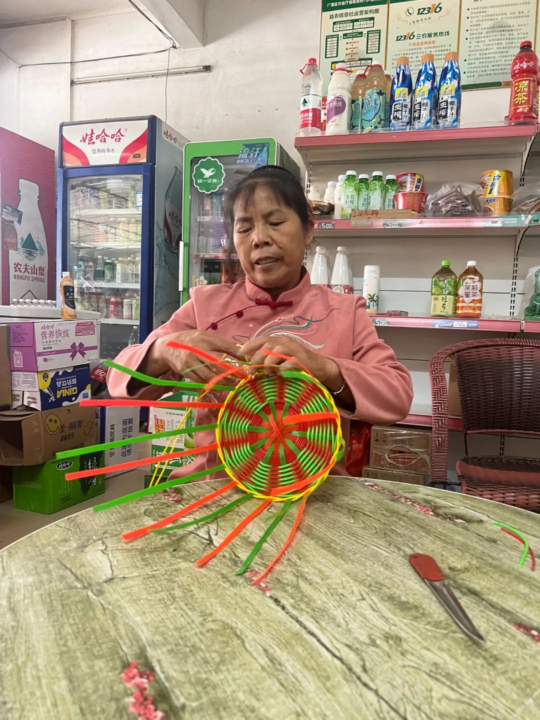 蓝大娘家住新圩乡丹灵村丹灵屯,50岁的她平时要看小卖部接收快递,抽空就编织各类篮子、簸箕、背篼等纯手工工艺品,等逢集日拿到集市上卖,以补贴家用。蓝大娘和往常一样坐在店里编篮子,看到志愿者的到来表示特别开心,招呼我们坐下后,便向我们讲起了编竹筐的过程。