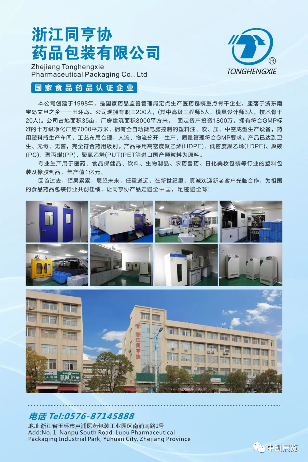 浙江同亨协药品包装有限公司,创建于 1994 年。是国家食品药品监督管理局定点生产医药包装重点骨干企业。本公司座落于浙东南宝岛文旦之乡一-玉环岛。公司现拥有职工 200 人,(其中高级工程师5人,模具设计师3 人,技术骨干 20 人)。公司占地面积 35 亩,厂房建筑面积10000 平方米,固定资产投资 3000 万,拥有符合 GMP 管理要求的十万级净化厂房 2000 平方米。2004 年以来,已取得国家食品药品监督管理局颁发的注册证。