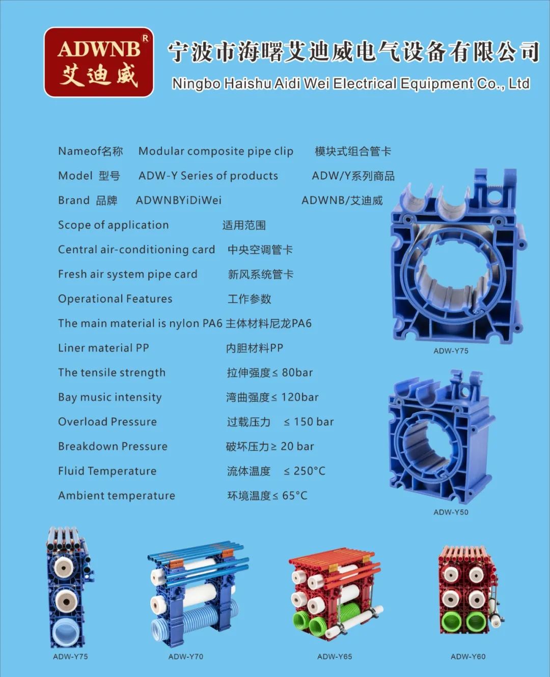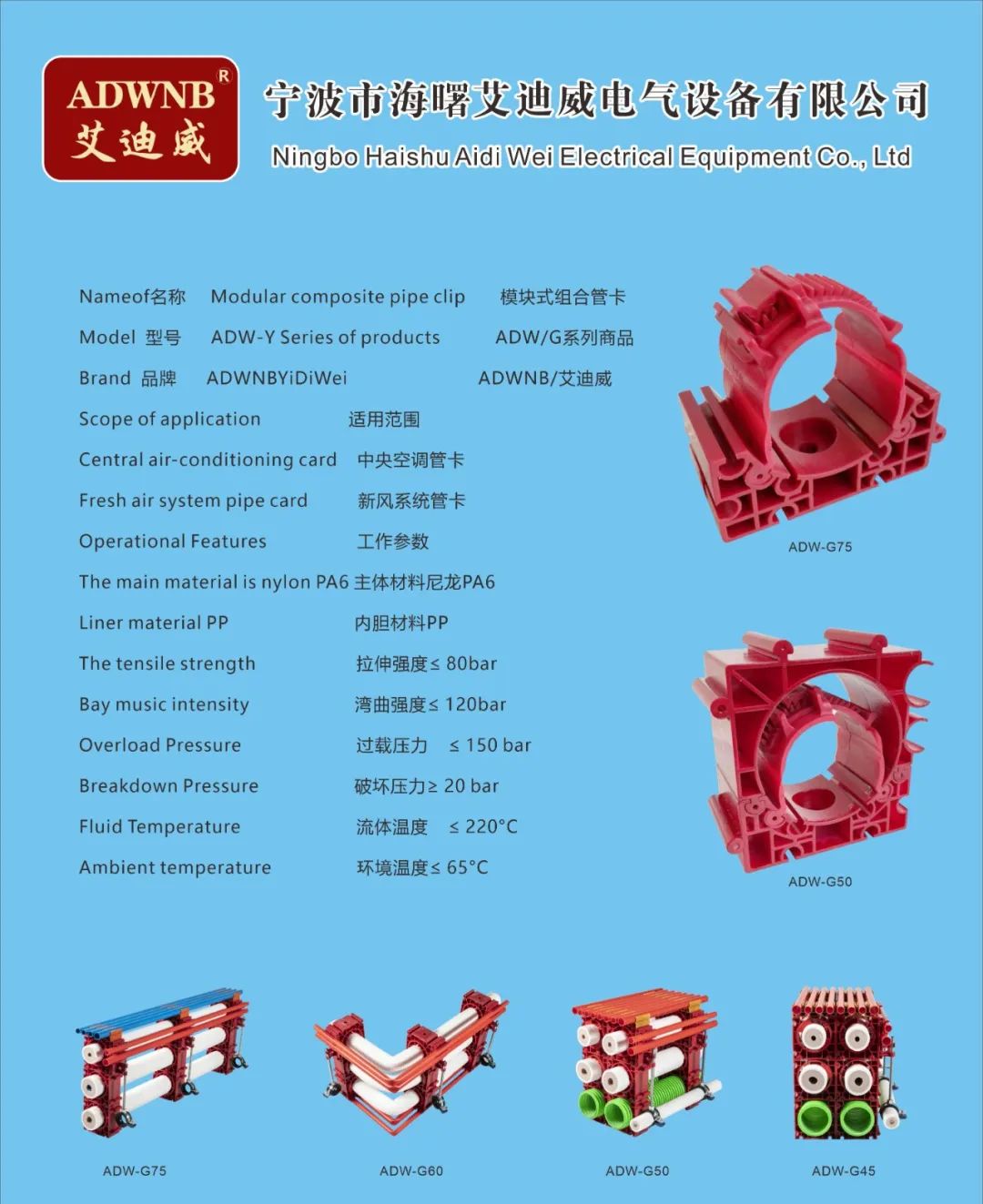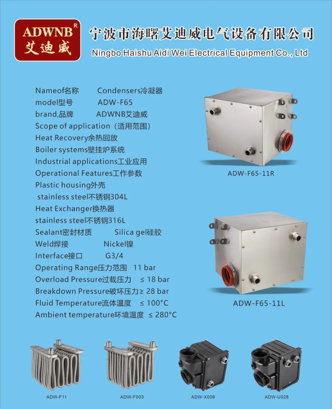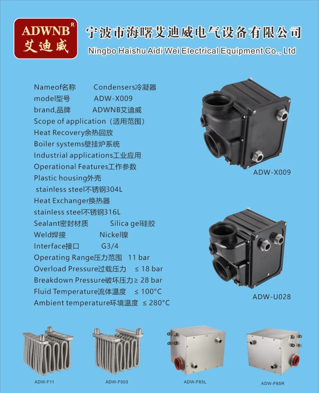 公司不仅自己开发、应用技术,还通过技术合作,走出自己的道路,形成自己的品牌ADWNB艾迪威。利用专业的生产平台不断进行产品研发,产品主要有中央空调和新风系统配套的模块式组合管卡、余热回收冷凝器、壁挂炉冷凝器、模块炉冷凝器、水压表、不锈钢波纹燃气管等系列产品。