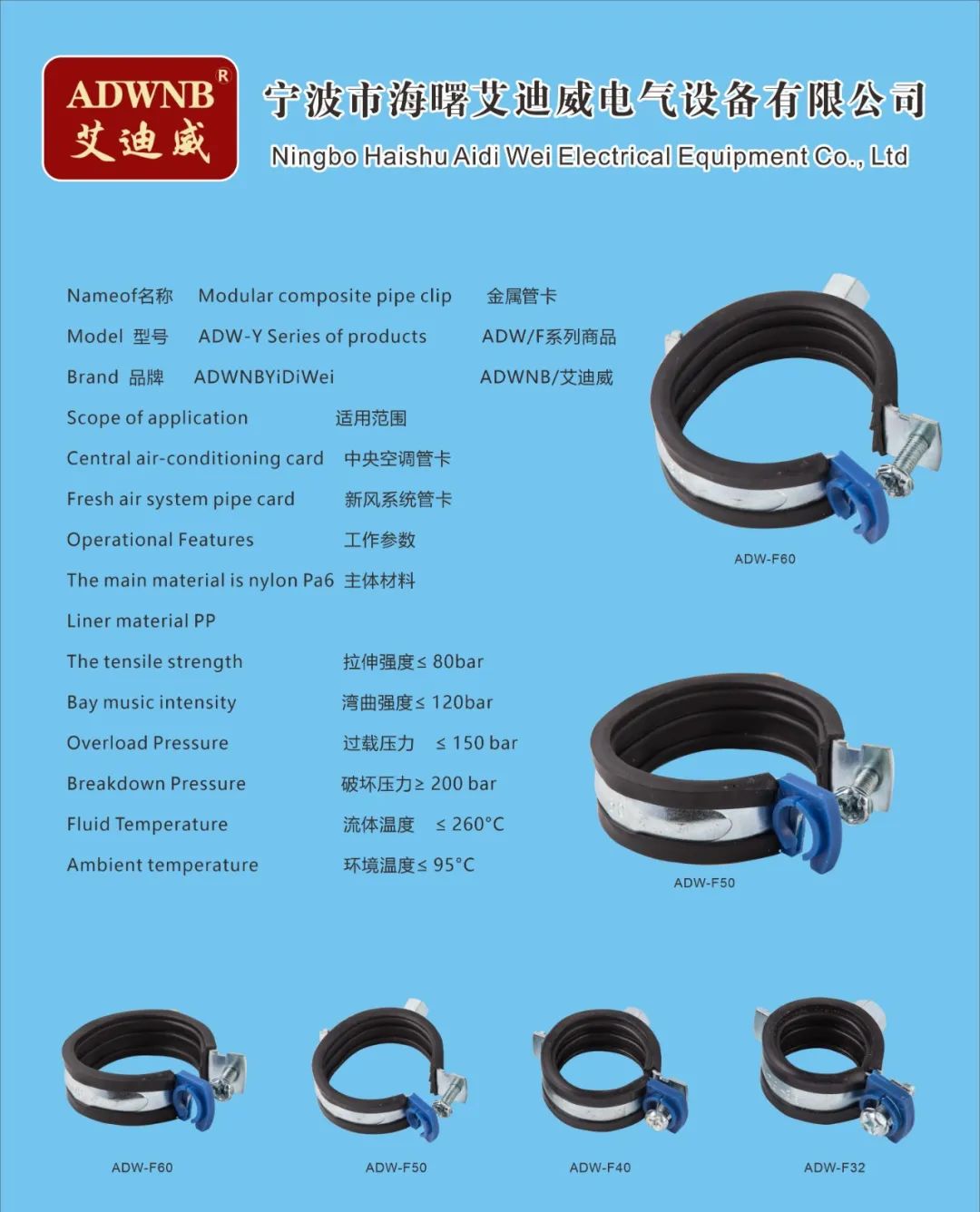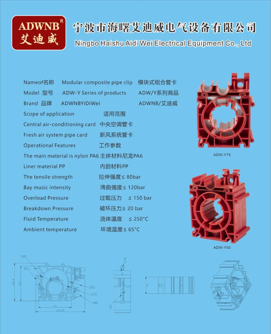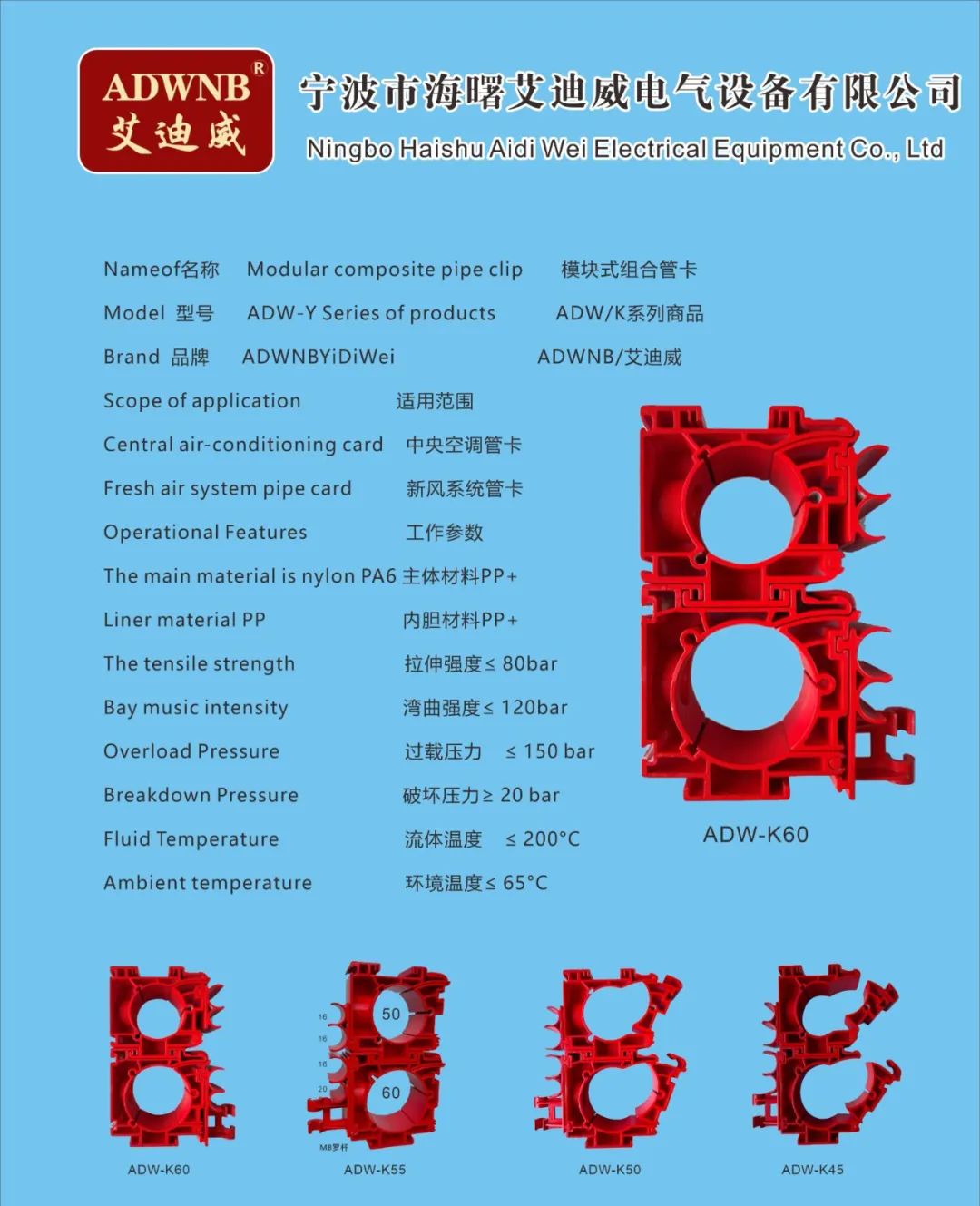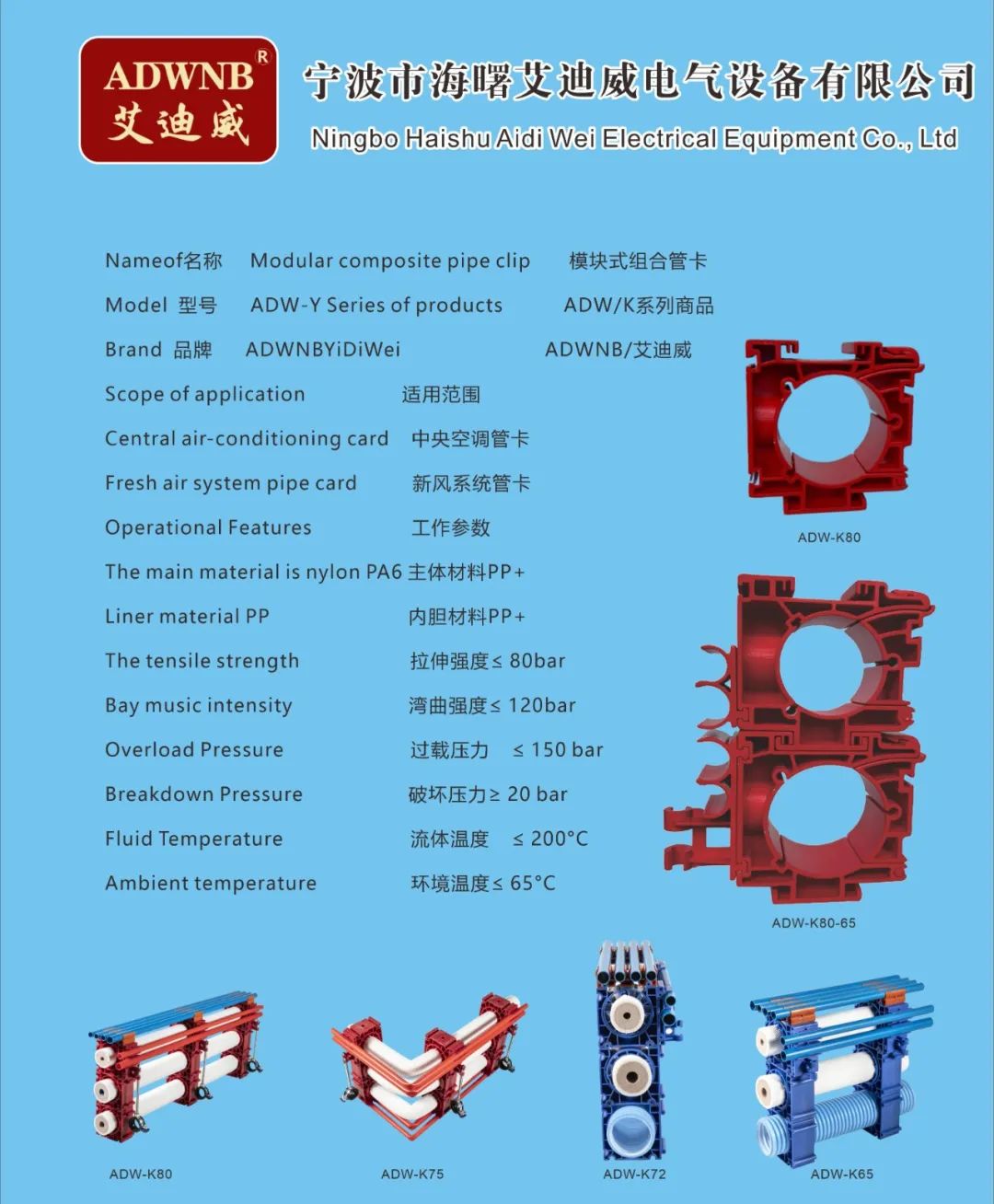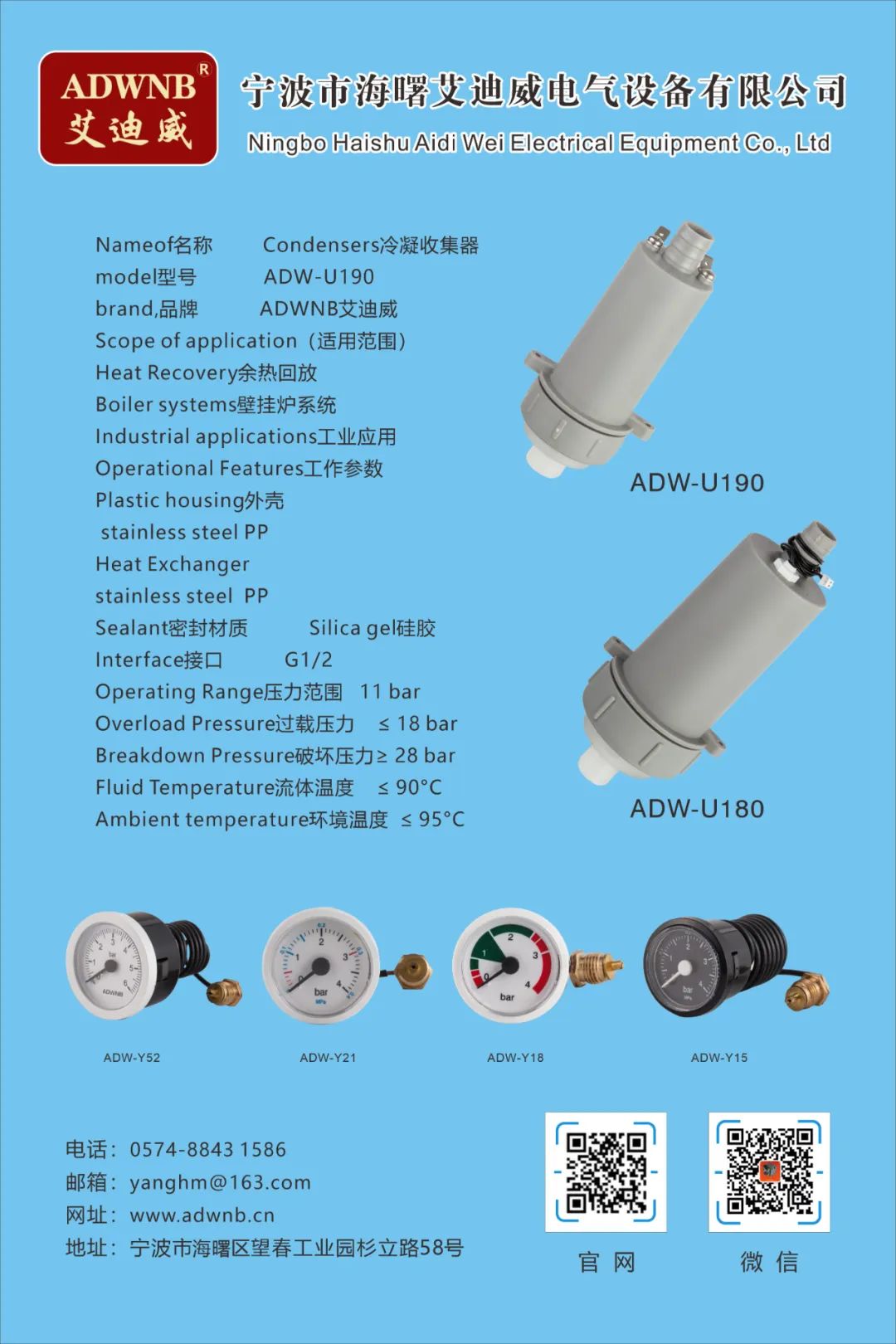 公司不仅自己开发、应用技术,还通过技术合作,走出自己的道路,形成自己的品牌ADWNB艾迪威。利用专业的生产平台不断进行产品研发,产品主要有中央空调和新风系统配套的模块式组合管卡、余热回收冷凝器、壁挂炉冷凝器、模块炉冷凝器、水压表、不锈钢波纹燃气管等系列产品。