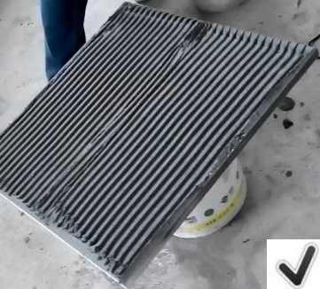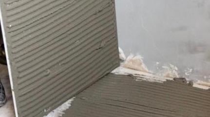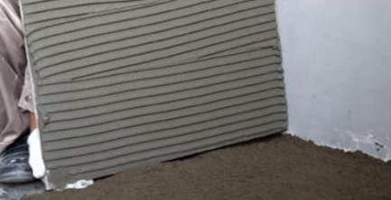 2)用锯齿镘刀将粘结剂浆料均匀地刮涂于玻化砖和基层的粘结面上(“双面刮浆法”);