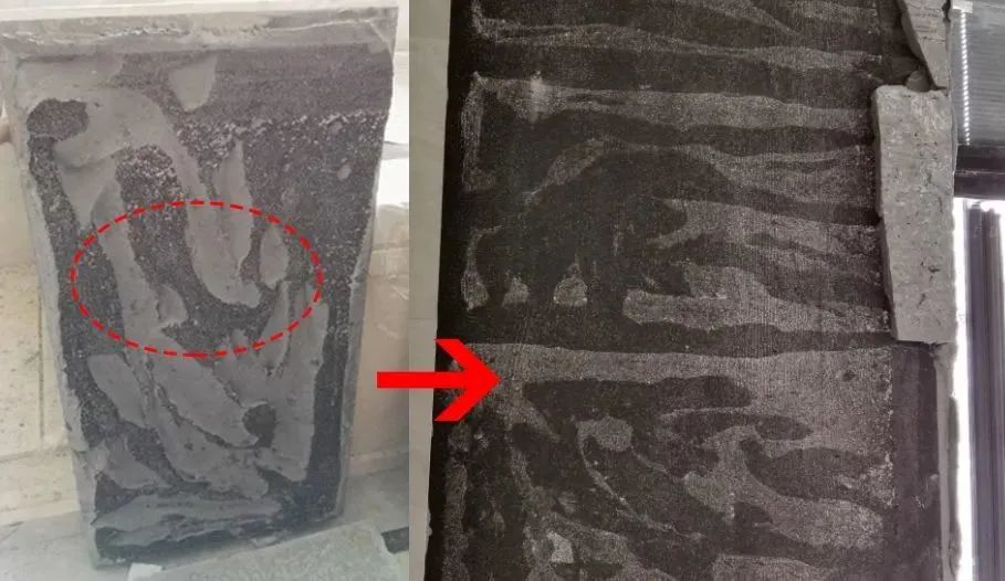 问题:半干砂浆水灰比控制不当,砂浆层密实度低。