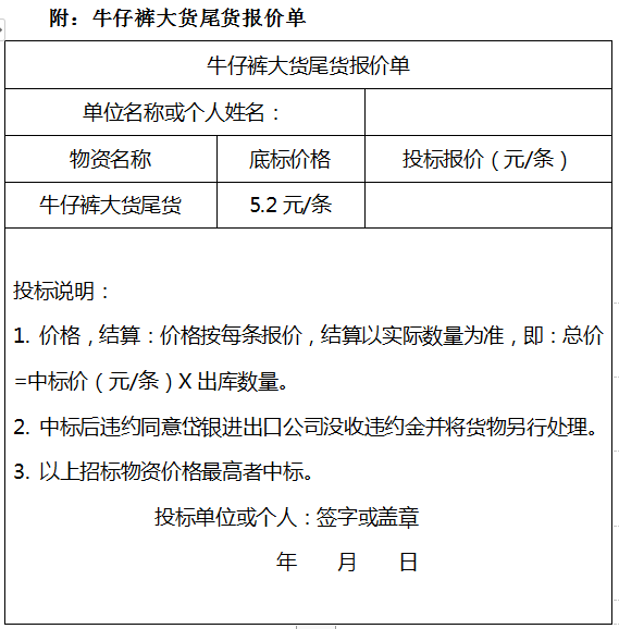 1.根据当前市场行情及牛仔裤的质量情况,本次处理的牛仔裤大货尾货底标价格为5.2元/件(长裤短裤同价),投标价必须高于底价,否则无效!