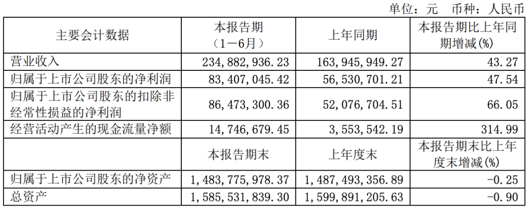 今年上半年,鼎阳科技实现营业收入2.35亿元,与2022年同期相比,增长43.27%;实现归属于母公司所有者的净利润为8341万元,与2022年同期相比,增长47.54%。