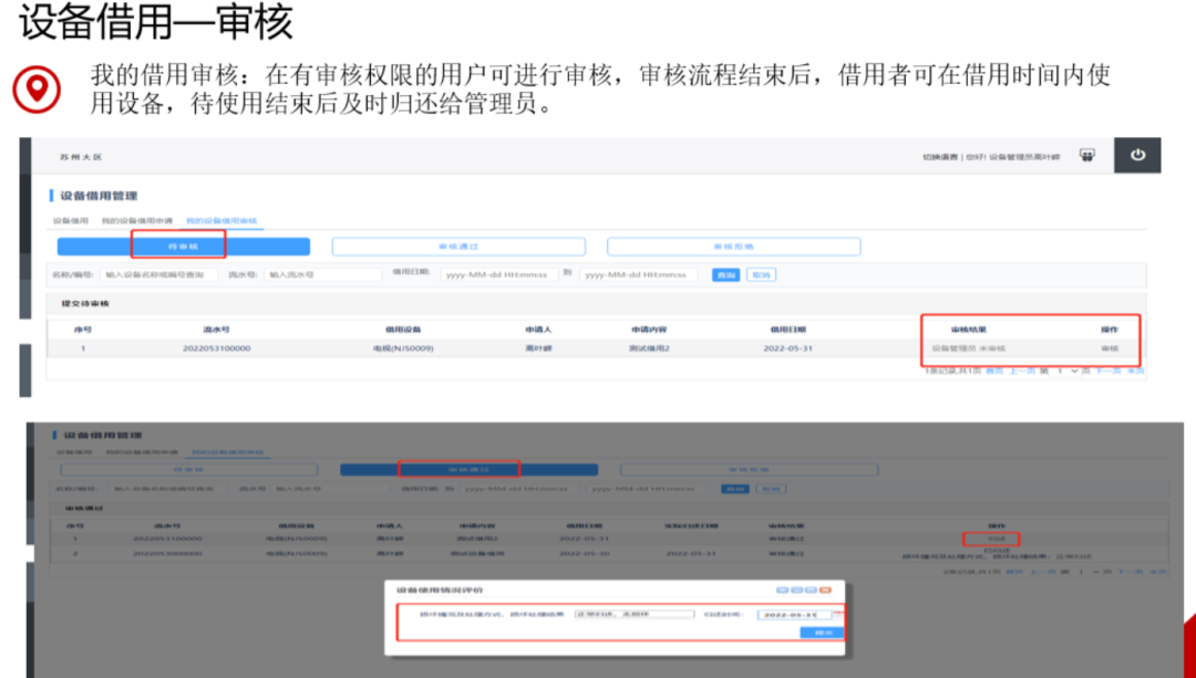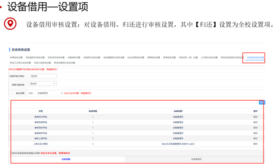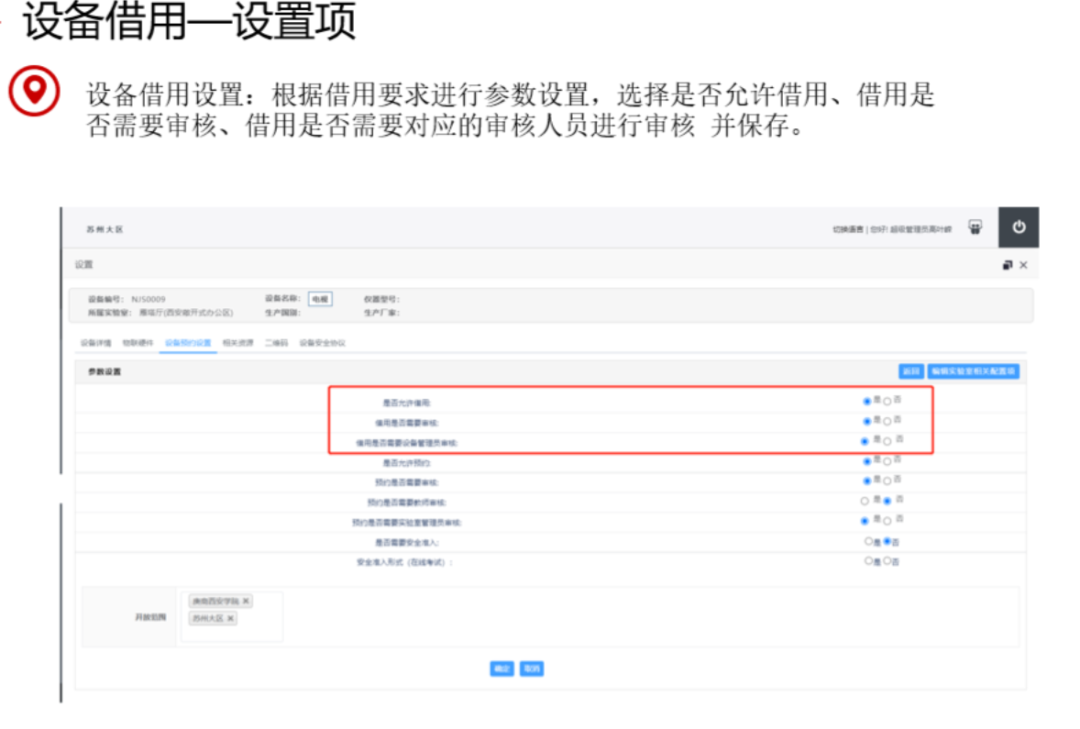 设备预约首先要进行配置项的设置,比如,是否允许设备借用,以及对审核层级的设置等,其次,按照顺序,用户进行提交借用申请信息,相应的审核人员进行审核,审核流程结束后,预约者可在预约时间内使用借用设备,使用结束后进行设备归还,由管理员确认设备归还