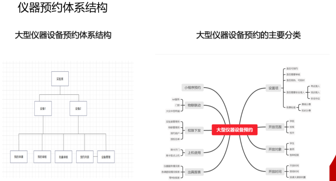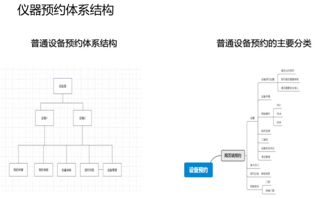 展示了两种仪器预约在网页端和小程序端包含的功能模块
