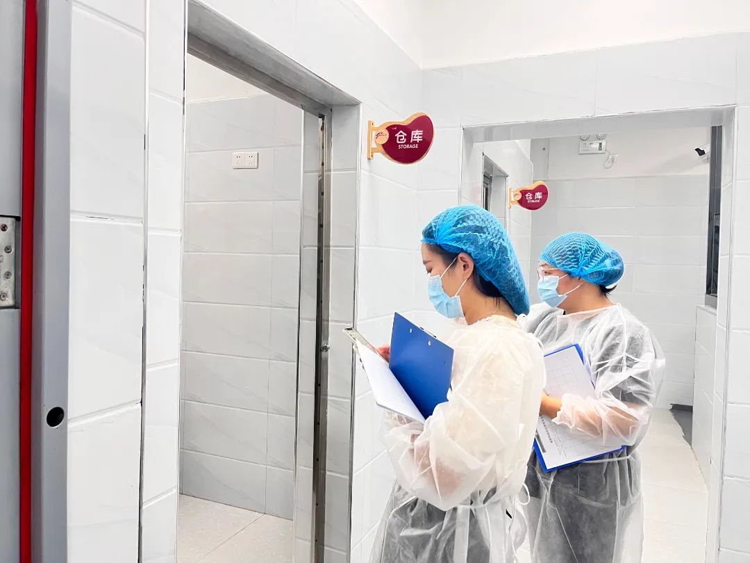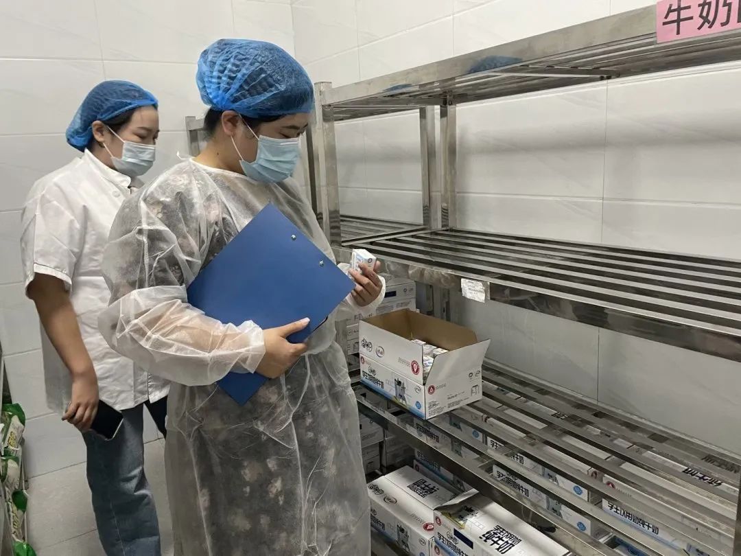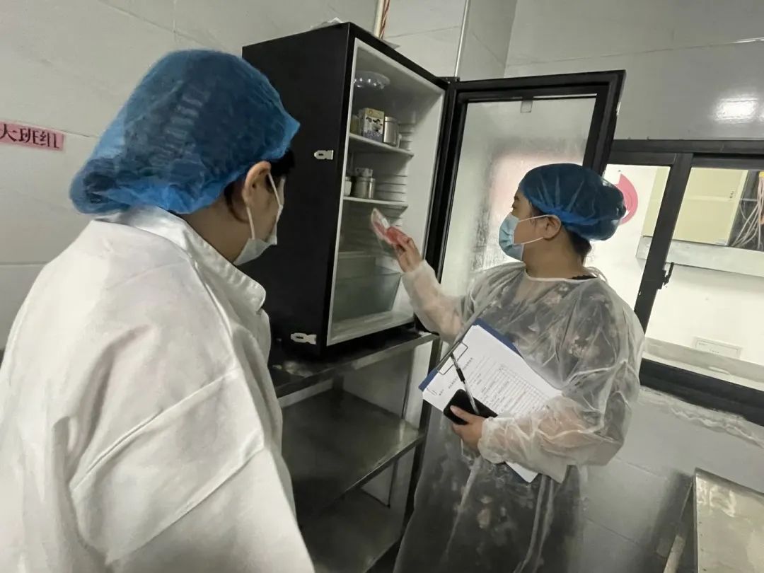检查小组在食堂负责人的陪同下,查看了食堂各项规章制度、环境卫生、食品储存、加工制作、食品留样以及从业人员健康证等情况。同时,查阅了采购、验收台账记录等相关表册,并逐一检查了操作间、粗加工间、食堂仓库等区域的安全卫生和消毒情况。