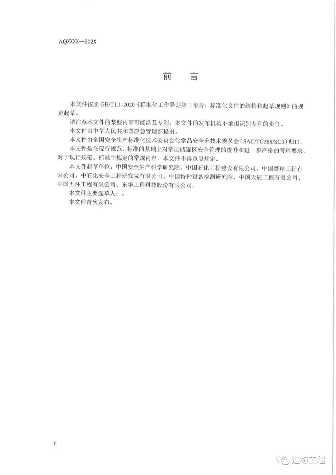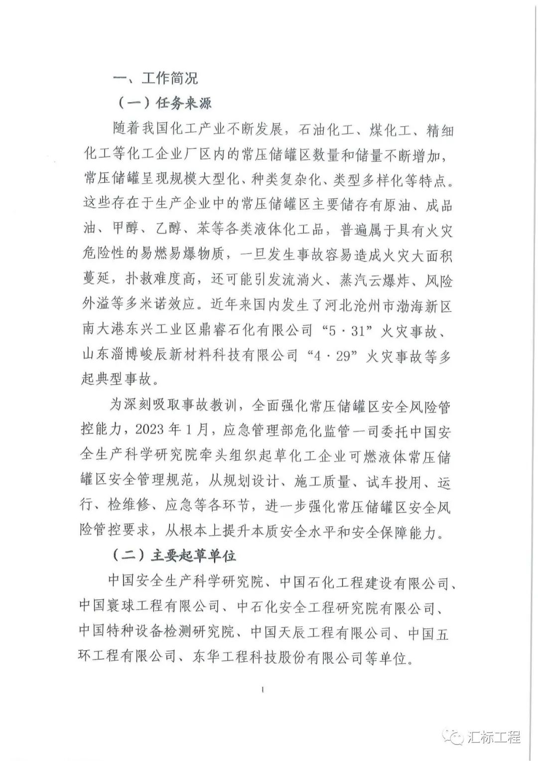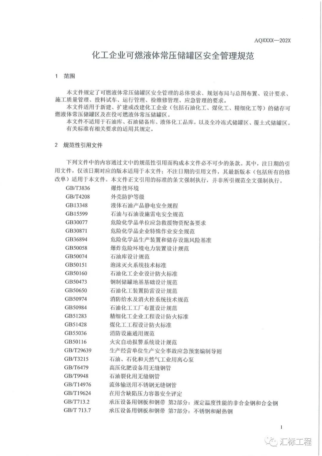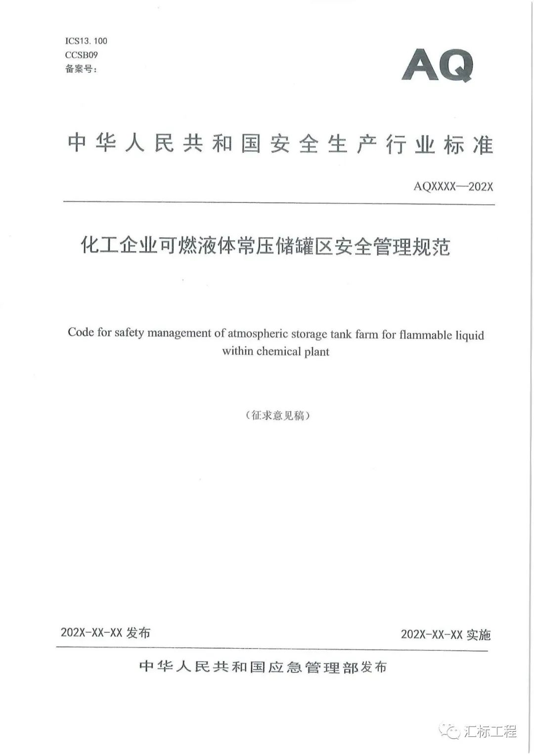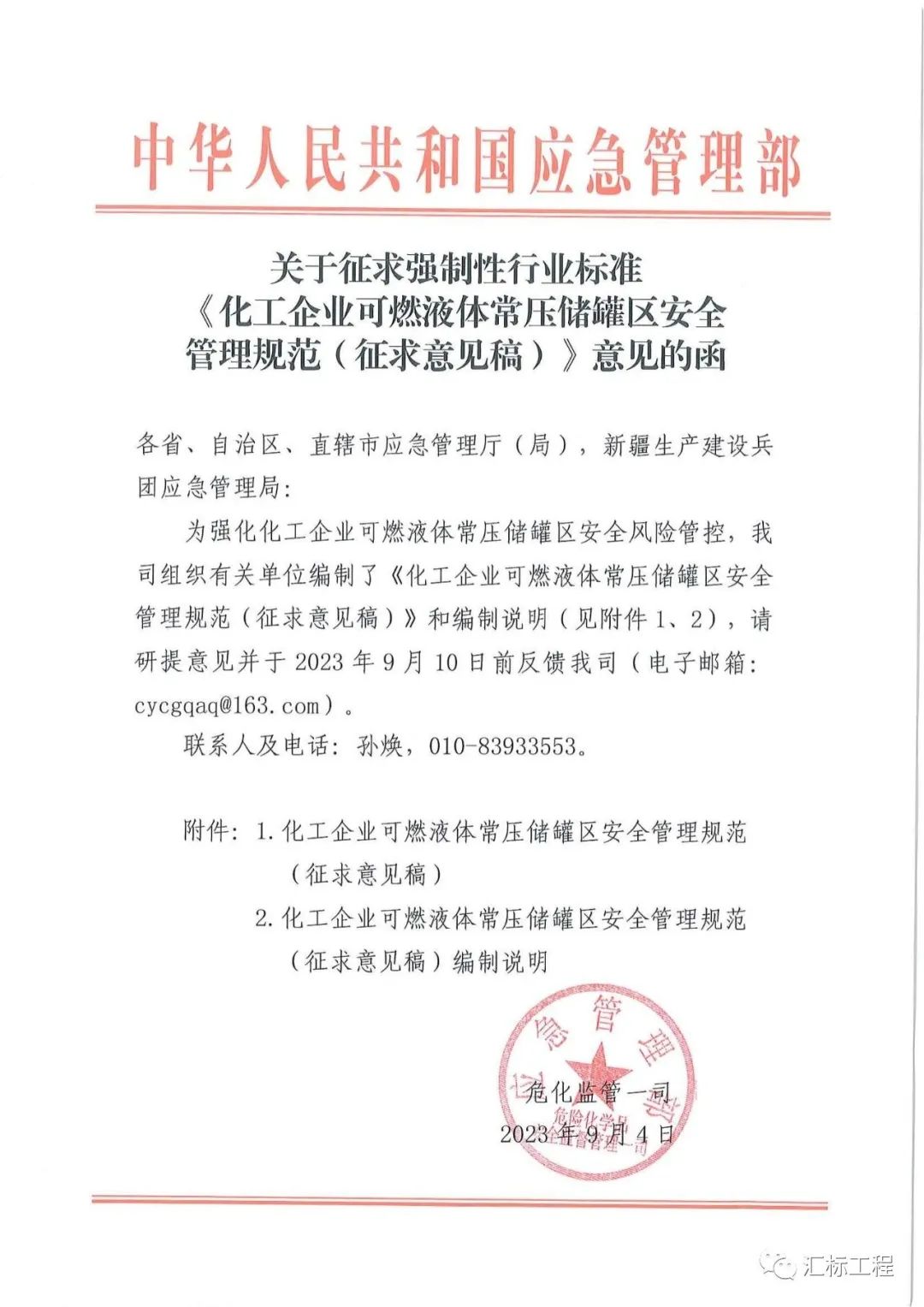 关于征求强制性行业标准《化工企业可燃液体常压储罐区安全管理规范(征求意见稿)》意见的函