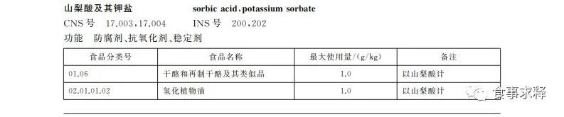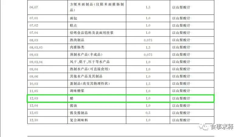 山梨酸及其钾盐允许使用范围不包括酥鱼(水产品罐头);醋(12.03)允许添加,最大使用量1.0g/kg(以山梨酸计)。