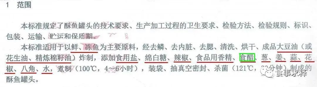从上图可以看到,酥鱼(罐头)产品标签配料和企业标准所列的原料为鲜、冻鱼、食用油、食用盐、绵白糖或白砂糖、食醋、食品用香精、香辛料。